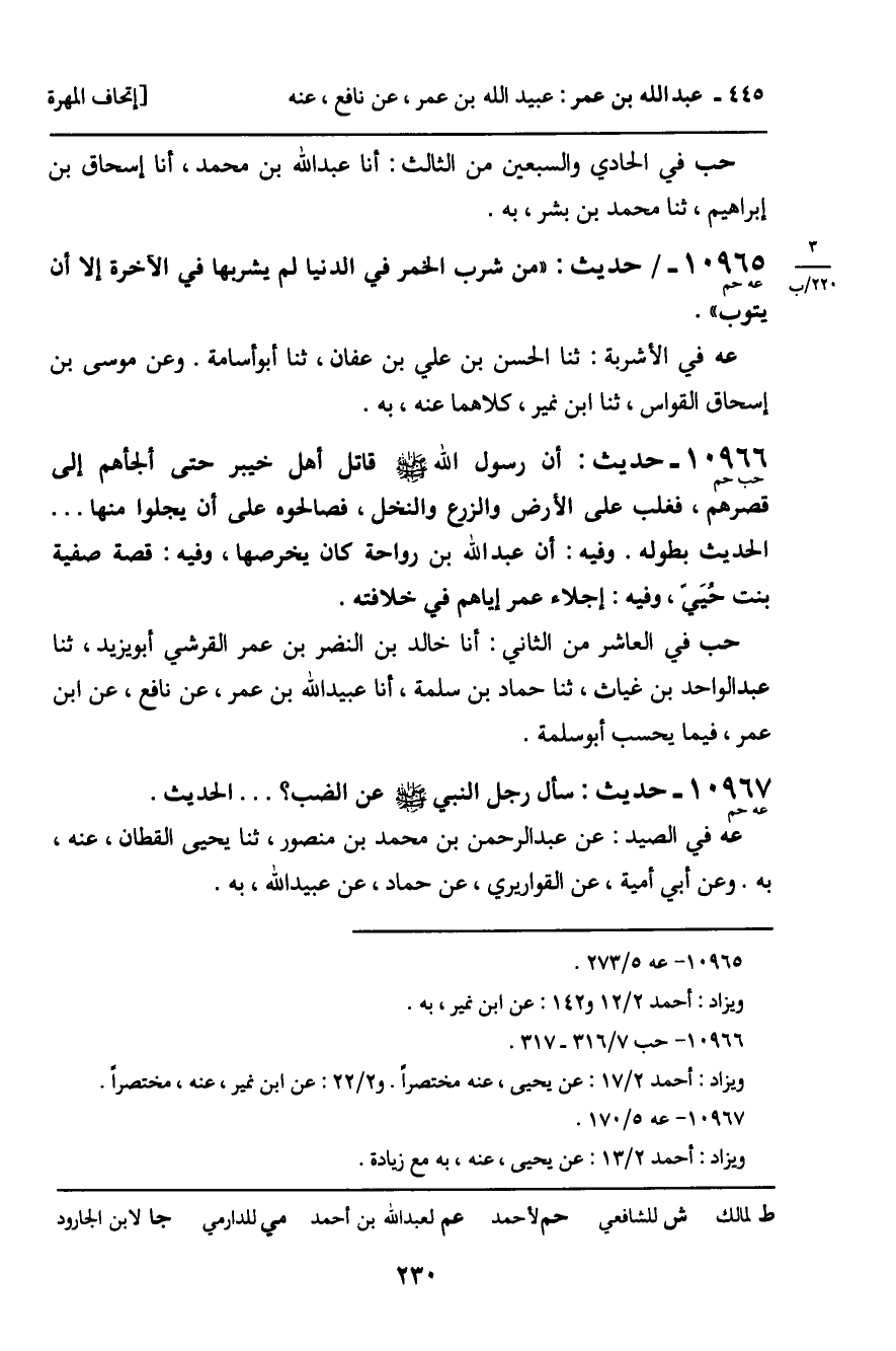 10966 - حَدِيثٌ (حب حم) : أَنَّ رَسُولَ اللَّهِ، صَلَّى اللَّهُ عَلَيْهِ وَسَلَّمَ، قَاتَلَ أَهْلَ خَيْبَرَ حَتَّى أَلْجَأَهُمْ إِلَى قَصْرِهِمْ، فَغَلَبَ عَلَى الأَرْضِ وَالزَّرْعِ وَالنَّخْلِ، فَصَالَحُوهُ عَلَى أَنْ يُجْلَوْا مِنْهَا ... الْحَدِيثُ بِطُولِهِ. وَفِيهِ: أَنَّ عَبْدَ اللَّهِ بْنَ رَوَاحَةَ كَانَ يَخْرُصُهَا، وَفِيهِ: قِصَّةُ صَفِيَّةَ بِنْتِ حُيَيٍّ، وَفِيهِ: إِجْلاءُ عُمَرَ إِيَّاهُمْ فِي خِلافَتِهِ. حب فِي الْعَاشِرِ مِنَ الثَّانِي: أَنَا خَالِدُ بْنُ النَّضْرِ بْنِ عُمَرَ الْقُرَشِيُّ أَبُو يَزِيدَ، ثنا عَبْدُ الْوَاحِدِ بْنُ غِيَاثٍ، ثنا حَمَّادُ بْنُ سَلَمَةَ، أَنَا عُبَيْدُ اللَّهِ بْنُ عُمَرَ، عَنْ نَافِعٍ، عَنِ ابْنِ عُمَرَ فِيمَا يَحْسَبُ أَبُو سَلَمَةَ.