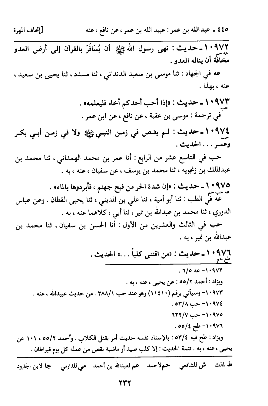 10972 - حَدِيثٌ (عه حم) : نَهَى رَسُولُ اللَّهِ، صَلَّى اللَّهُ عَلَيْهِ وَسَلَّمَ، أَنْ يُسَافَرَ بِالْقُرْآنِ إِلَى أَرْضِ الْعَدُوِّ مَخَافَةَ أَنْ يَنَالَهُ الْعَدُوُّ. عه فِي الْجِهَادِ: ثنا مُوسَى بْنُ سَعِيدٍ الدَّنْدَانِيُّ، ثنا مُسَدَّدٌ، ثنا يَحْيَى بْنُ سَعِيدٍ، عَنْهُ، بِهَذَا.