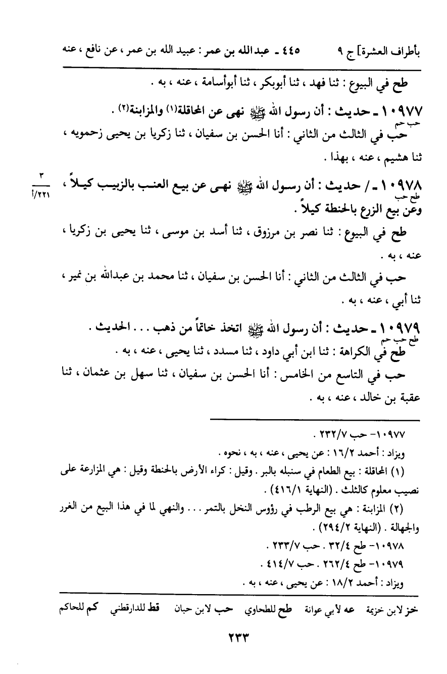 10977 - حَدِيثٌ (حب حم) : أَنَّ رَسُولَ اللَّهِ، صَلَّى اللَّهُ عَلَيْهِ وَسَلَّمَ، نَهَى عَنِ الْمُحَاقَلَةِ وَالْمُزَابَنَةِ. حب فِي الثَّالِثِ مِنَ الثَّانِي: أَنَا الْحَسَنُ بْنُ سُفْيَانَ، ثنا زَكَرِيَّا بْنُ يَحْيَى زَحْمَوَيْهِ، ثنا هُشَيْمٌ، عَنْهُ، بِهَذَا.