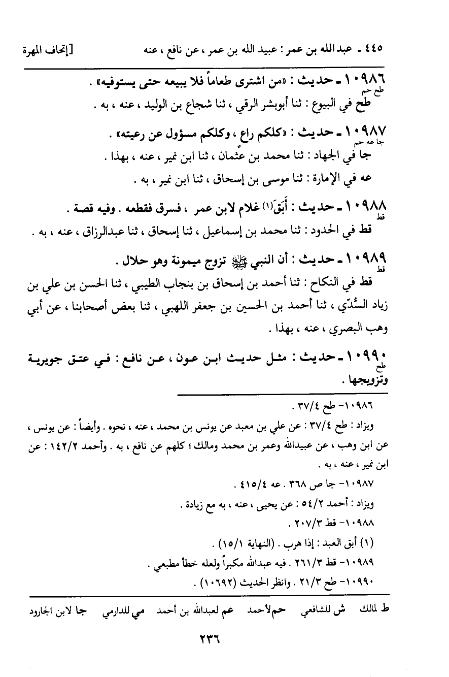 10987 - حَدِيثٌ (جا عه حم) : " كُلُّكُمْ رَاعٍ، وَكُلُّكُمْ مَسْئُولٌ عَنْ رَعِيَّتِهِ ". جا فِي الْجِهَادِ: ثنا مُحَمَّدُ بْنُ عُثْمَانَ، ثنا ابْنُ نُمَيْرٍ، عَنْهُ، بِهَذَا. عه فِي الإِمَارَةِ: ثنا مُوسَى بْنُ إِسْحَاقَ، ثنا ابْنُ نُمَيْرٍ، بِهِ.