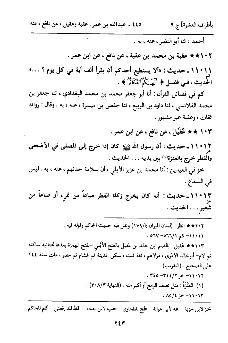 11011 - حَدِيثٌ (كم) : " أَلا يَسْتَطِيعُ أَحَدُكُمْ أَنْ يَقْرَأَ أَلْفَ آيَةٍ فِي كُلِّ يَوْمٍ؟ ... " الْحَدِيثَ، فِي فَضْلِ أَلْهَاكُمُ التَّكَاثُرُ [سورة: التكاثر، آية 1] . كم فِي فَضَائِلِ الْقُرْآنِ: أَنَا أَبُو جَعْفَرٍ مُحَمَّدُ بْنُ مُحَمَّدٍ الْبَغْدَادِيُّ، ثنا جَعْفَرُ بْنُ مُحَمَّدٍ الْقَلانِسِيُّ، ثنا دَاوُدُ بْنُ الرَّبِيعِ، ثنا حَفْصُ بْنُ مَيْسَرَةَ، عَنْهُ، بِهِ. وَقَالَ: رُوَاتُهُ ثِقَاتٌ، وَعُقْبَةُ غَيْرُ مَشْهُورٍ.