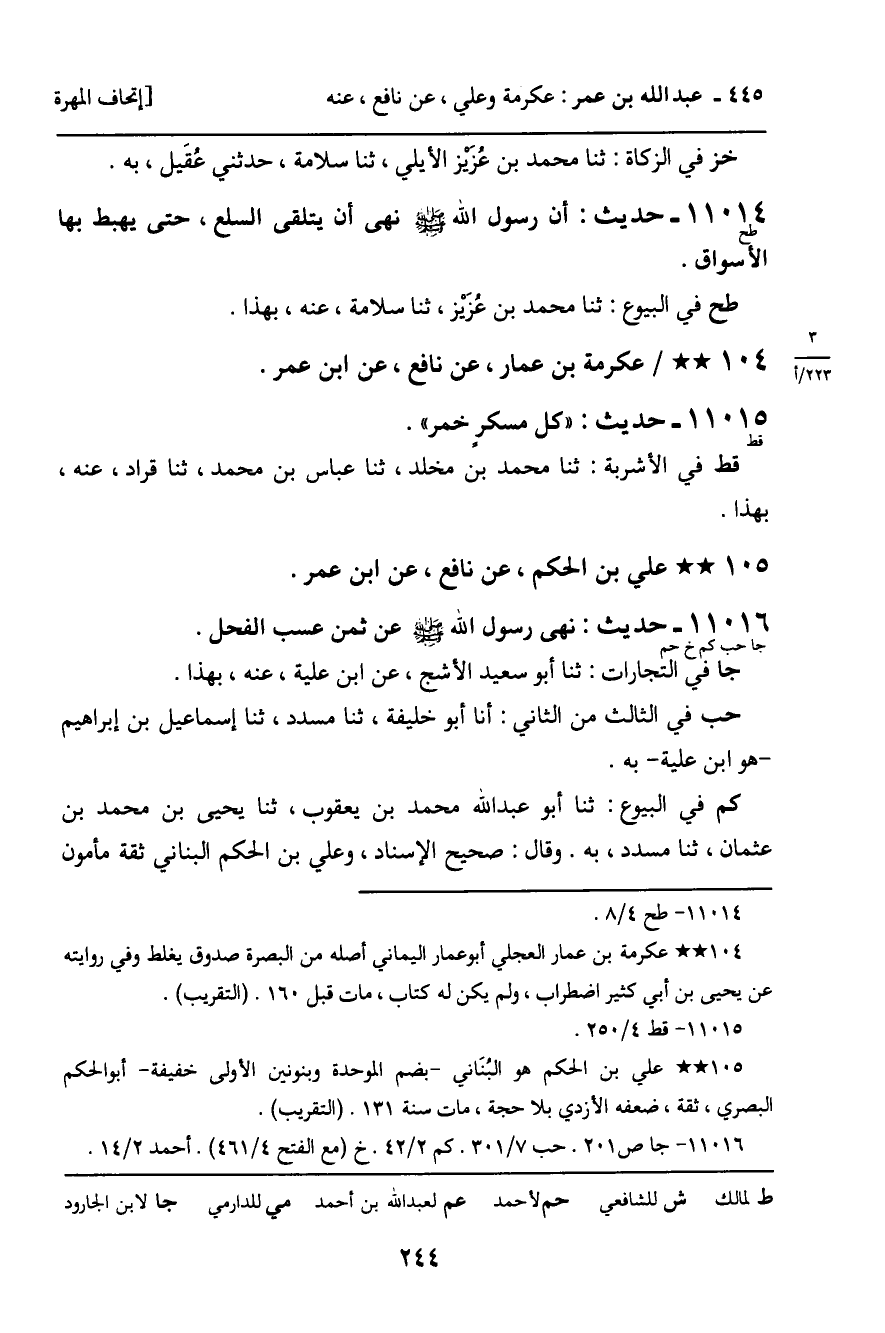 جا فِي التِّجَارَاتِ: ثنا أَبُو سَعِيدٍ الأَشَجُّ، عَنِ ابْنِ عُلَيَّةَ، عَنْهُ، بِهَذَا. حب فِي الثَّالِثِ مِنَ الثَّانِي: أَنَا أَبُو خَلِيفَةَ، ثنا مُسَدَّدٌ، ثنا إِسْمَاعِيلُ بْنُ إِبْرَاهِيمَ، هُوَ ابْنُ عُلَيَّةَ، بِهِ. كم فِي الْبُيُوعِ: ثنا أَبُو عَبْدِ اللَّهِ مُحَمَّدُ بْنُ يَعْقُوبَ، ثنا يَحْيَى بْنُ مُحَمَّدِ بْنِ عُثْمَانَ، ثنا مُسَدَّدٌ، بِهِ. وَقَالَ: صَحِيحُ الإِسْنَادِ، وَعَلِيُّ بْنُ الْحَكَمِ الْبُنَانِيُّ، ثِقَةٌ مَأْمُونٌ