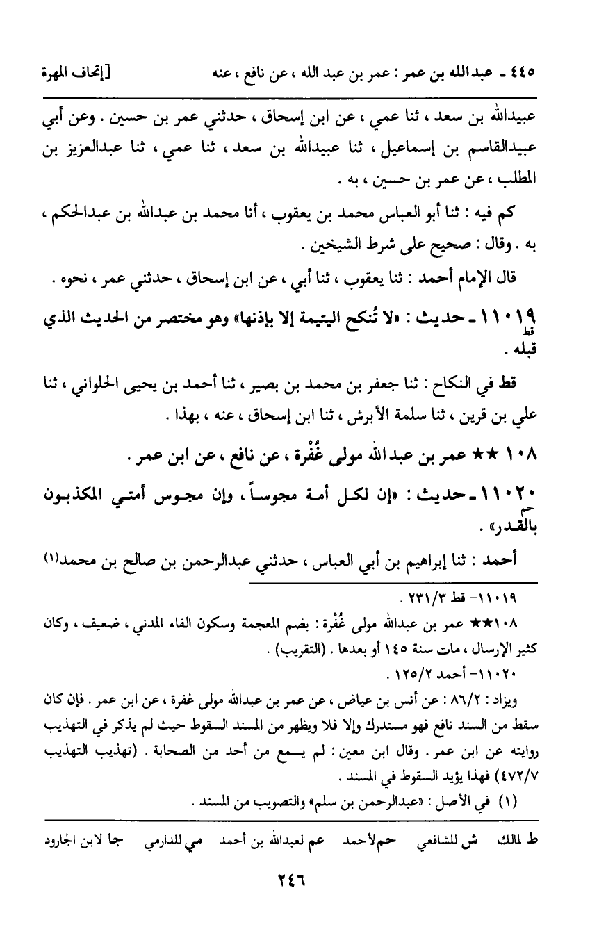 11020 - حَدِيثٌ (حم) : " إِنَّ لِكُلِّ أُمَّةٍ مَجُوسًا، وَإِنَّ مَجُوسَ أُمَّتِي الْمُكَذِّبُونَ بِالْقَدَرِ ". أَحْمَدُ: ثنا إِبْرَاهِيمُ بْنُ أَبِي الْعَبَّاسِ، حَدَّثَنِي عَبْدُ الرَّحْمَنِ بْنُ صَالِحِ بْنِ مُحَمَّدٍ