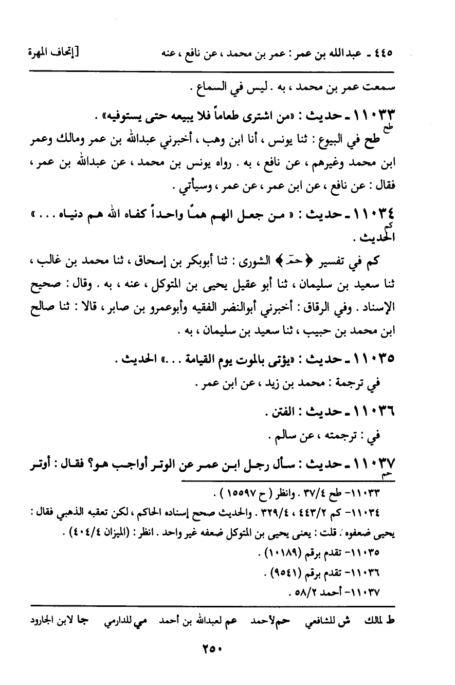 11033 - حَدِيثٌ (طح) : " مَنِ اشْتَرَى طَعَامًا فَلا يَبِيعُهُ حَتَّى يَسْتَوْفِيَهُ ". طح فِي الْبُيُوعِ: ثنا يُونُسُ، أَنَا ابْنُ وَهْبٍ، أَخْبَرَنِي عَبْدُ اللَّهِ بْنُ عُمَرَ، وَمَالِكٌ، وَعُمَرُ بْنُ مُحَمَّدٍ، وَغَيْرُهُمْ، عَنْ نَافِعٍ، بِهِ. رَوَاهُ يُونُسُ بْنُ مُحَمَّدٍ، عَنْ عَبْدِ اللَّهِ بْنِ عُمَرَ، فَقَالَ: عَنْ نَافِعٍ، عَنِ ابْنِ عُمَرَ، عَنْ عُمَرَ، وَسَيَأْتِي.