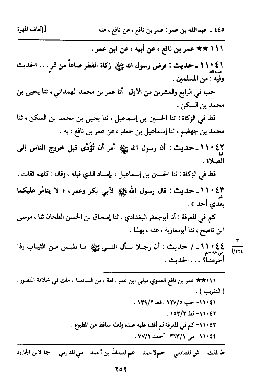 11041 - حَدِيثٌ (حب قط) : فَرَضَ رَسُولُ اللَّهِ، صَلَّى اللَّهُ عَلَيْهِ وَسَلَّمَ، زَكَاةَ الْفِطْرِ صَاعًا مِنْ تَمْرٍ ... الْحَدِيثَ، وَفِيهِ: مِنَ الْمُسْلِمِينَ. حب فِي الرَّابِعِ وَالْعِشْرِينَ مِنَ الأَوَّلِ: أَنَا عُمَرُ بْنُ مُحَمَّدٍ الْهَمْدَانِيُّ، ثنا يَحْيَى بْنُ مُحَمَّدِ بْنِ السَّكَنِ. قط فِي الزَّكَاةِ: ثنا الْحُسَيْنُ بْنُ إِسْمَاعِيلَ، ثنا يَحْيَى بْنُ مُحَمَّدِ بْنِ السَّكَنِ، ثنا مُحَمَّدُ بْنُ جَهْضَمٍ، ثنا إِسْمَاعِيلُ بْنُ جَعْفَرٍ، عَنْ عُمَرَ بْنِ نَافِعٍ، بِهِ.