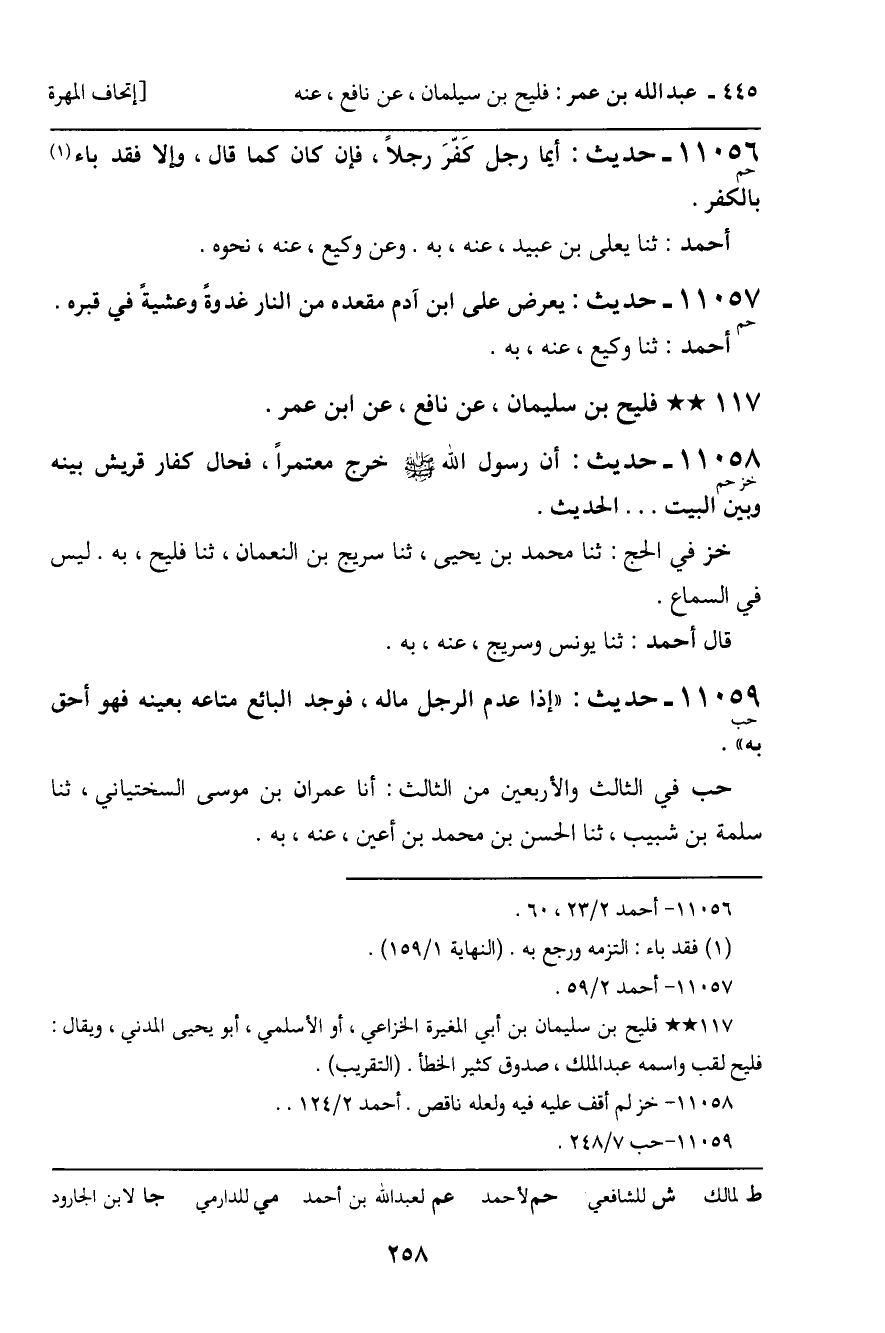 11058 - حَدِيثٌ (خز حم) : أَنَّ رَسُولَ اللَّهِ , صَلَّى اللَّهُ عَلَيْهِ وَسَلَّمَ، خَرَجَ مُعْتَمِرًا، فَحَالَ كُفَّارُ قُرَيْشٍ بَيْنَهُ وَبَيْنَ الْبَيْتِ ... الْحَدِيثَ. خز فِي الْحَجِّ: ثنا مُحَمَّدُ بْنُ يَحْيَى، ثنا سُرَيْجُ بْنُ النُّعْمَانِ، ثنا فُلَيْحٌ، بِهِ. لَيْسَ فِي السَّمَاعِ. قَالَ أَحْمَدُ: ثنا يُونُسُ، وَسُرَيْجٌ، عَنْهُ، بِهِ.