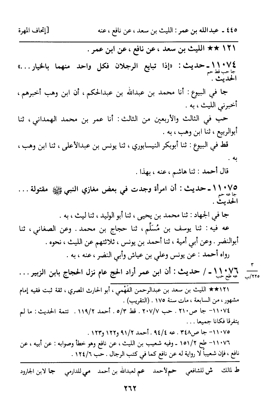 11074 - حَدِيثٌ (جا حب قط حم) : " إِذَا تَبَايَعَ الرَّجُلانِ فَكُلُّ وَاحِدٍ مِنْهُمَا بِالْخِيَارِ ... " الْحَدِيثَ. جا فِي الْبُيُوعِ: أَنَا مُحَمَّدُ بْنُ عَبْدِ اللَّهِ بْنِ عَبْدِ الْحَكَمِ، أَنَا ابْنُ وَهْبٍ أَخْبَرَهُمْ، أَخْبَرَنِي اللَّيْثُ، بِهِ. حب فِي الثَّالِثِ وَالأَرْبَعِينَ مِنَ الثَّالِثِ: أَنَا عُمَرُ بْنُ مُحَمَّدٍ الْهَمْدَانِيُّ، ثنا أَبُو الرَّبِيعِ، ثنا ابْنُ وَهْبٍ، بِهِ. قط فِي الْبُيُوعِ: ثنا أَبُو بَكْرٍ النَّيْسَابُورِيُّ، ثنا يُونُسُ بْنُ عَبْدِ الأَعْلَى، ثنا ابْنُ وَهْبٍ، بِهِ. قَالَ أَحْمَدُ: ثنا هَاشِمٌ، عَنْهُ، بِهَذَا.