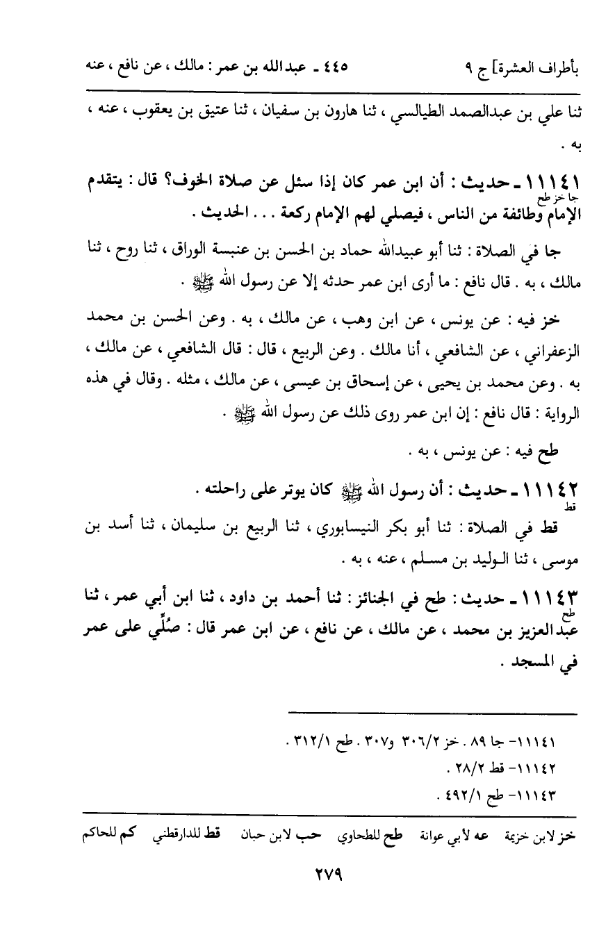 11141 - حَدِيثٌ (جا خز طح) : أَنَّ ابْنَ عُمَرَ كَانَ إِذَا سُئِلَ عَنْ صَلاةِ الْخَوْفِ؟ قَالَ: يَتَقَدَّمُ الإِمَامُ وَطَائِفَةٌ مِنَ النَّاسِ، فَيُصَلِّي لَهُمُ الإِمَامُ رَكْعَةً ... الْحَدِيثُ. جا فِي الصَّلاةِ: ثنا أَبُو عُبَيْدِ اللَّهِ حَمَّادُ بْنُ الْحَسَنِ بْنِ عَنْبَسَةَ الْوَرَّاقُ، ثنا رَوْحٌ، ثنا مَالِكٌ، بِهِ. قَالَ نَافِعٌ: مَا أَرَى ابْنَ عُمَرَ حَدَّثَهُ إِلا عَنْ رَسُولِ اللَّهِ , صَلَّى اللَّهُ عَلَيْهِ وَسَلَّمَ. خز فِيهِ: عَنْ يُونُسَ، عَنِ ابْنِ وَهْبٍ، عَنْ مَالِكٍ، بِهِ. وَعَنِ الْحَسَنِ بْنِ مُحَمَّدٍ الزَّعْفَرَانِيِّ، عَنِ الشَّافِعِيِّ، أَنَا مَالِكٌ. وَعَنِ الرَّبِيعِ، قَالَ: قَالَ الشَّافِعِيُّ، عَنْ مَالِكٍ، بِهِ. وَعَنْ مُحَمَّدِ بْنِ يَحْيَى، عَنْ إِسْحَاقَ بْنِ عِيسَى، عَنْ مَالِكٍ، مِثْلَهُ. وَقَالَ فِي هَذِهِ الرِّوَايَةِ: قَالَ نَافِعٌ: إِنَّ ابْنَ عُمَرَ رَوَى ذَلِكَ عَنْ رَسُولِ اللَّهِ , صَلَّى اللَّهُ عَلَيْهِ وَسَلَّمَ. طح فِيهِ: عَنْ يُونُسَ، بِهِ.