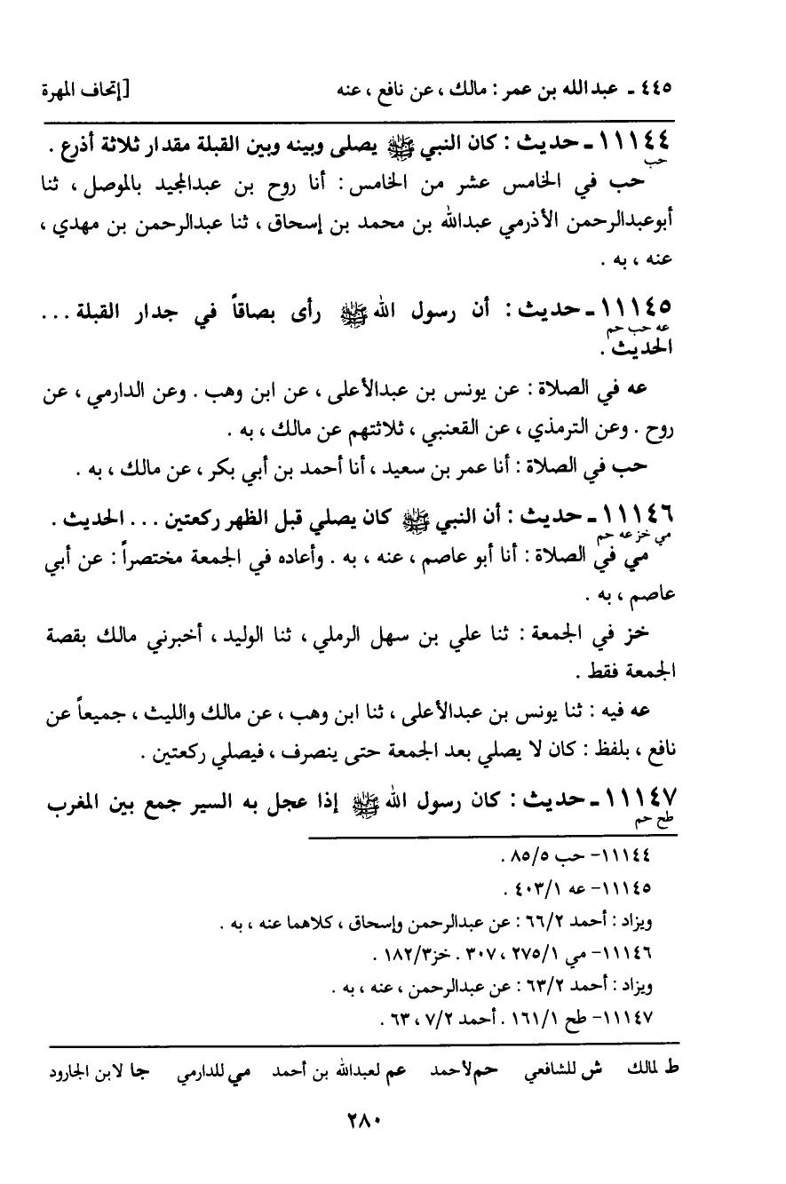 11146 - حَدِيثٌ (مي خز عه حم) : أَنَّ النَّبِيَّ , صَلَّى اللَّهُ عَلَيْهِ وَسَلَّمَ، كَانَ يُصَلِّي قَبْلَ الظُّهْرِ رَكْعَتَيْنِ ... الْحَدِيثَ. مي فِي الصَّلاةِ: أَنَا أَبُو عَاصِمٍ، عَنْهُ، بِهِ. وَأَعَادَهُ فِي الْجُمُعَةِ مُخْتَصَرًا: عَنْ أَبِي عَاصِمٍ، بِهِ. خز فِي الْجُمُعَةِ: ثنا عَلِيُّ بْنُ سَهْلٍ الرَّمْلِيُّ، ثنا الْوَلِيدُ، أَخْبَرَنِي مَالِكٌ بِقِصَّةِ الْجُمُعَةِ فَقَطْ. عه فِيهِ: ثنا يُونُسُ بْنُ عَبْدِ الأَعْلَى، ثنا ابْنُ وَهْبٍ، عَنْ مَالِكٍ، وَاللَّيْثِ، جَمِيعًا عَنْ نَافِعٍ، بِلَفْظِ: كَانَ لا يُصَلِّي بَعْدَ الْجُمُعَةِ حَتَّى يَنْصَرِفَ، فَيُصَلِّي رَكْعَتَيْنِ.