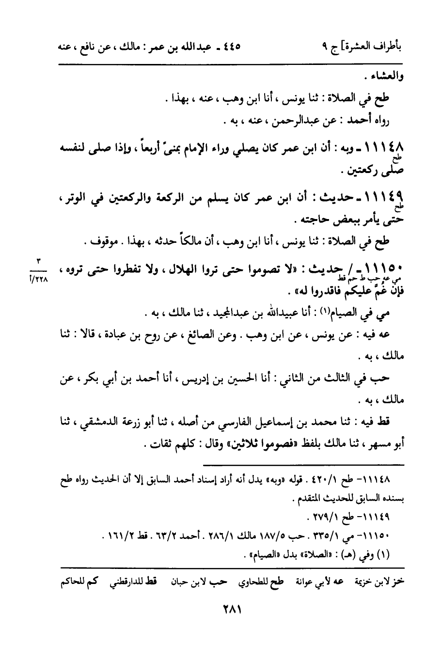 11150 - حَدِيثٌ (مي عه حب ط حم قط) : " لا تَصُومُوا حَتَّى تَرَوُا الْهِلالَ، وَلا تُفْطِرُوا حَتَّى تَرَوْهُ، فَإِنْ غُمَّ عَلَيْكُمْ فَاقْدِرُوا لَهُ ". مي فِي الصِّيَامِ: أَنَا عُبَيْدُ اللَّهِ بْنُ عَبْدِ الْمَجِيدِ، ثنا مَالِكٌ، بِهِ. عه فِيهِ: عَنْ يُونُسَ، عَنِ ابْنِ وَهْبٍ. وَعَنِ الصَّائِغِ، عَنْ رَوْحِ بْنِ عُبَادَةَ، قَالا: ثنا مَالِكٌ، بِهِ. حب فِي الثَّالِثِ مِنَ الثَّانِي: أَنَا الْحُسَيْنُ بْنُ إِدْرِيسَ، أَنَا أَحْمَدُ بْنُ أَبِي بَكْرٍ، عَنْ مَالِكٍ، بِهِ. قط فِيهِ: ثنا مُحَمَّدُ بْنُ إِسْمَاعِيلَ الْفَارِسِيُّ مِنْ أَصْلِهِ، ثنا أَبُو زُرْعَةَ الدِّمَشْقِيُّ، ثنا أَبُو مُسْهِرٍ، ثنا مَالِكٌ بِلَفْظِ: " فَصُومُوا ثَلاثِينَ " وَقَالَ: كُلُّهُمْ ثِقَاتٌ.