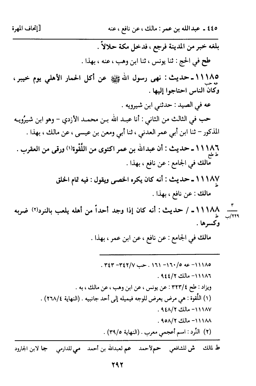 11185 - حَدِيثٌ (عه حب) : نَهَى رَسُولُ اللَّهِ , صَلَّى اللَّهُ عَلَيْهِ وَسَلَّمَ، عَنْ أَكْلِ الْحِمَارِ الأَهْلِيِّ يَوْمَ خَيْبَرَ، وَكَانَ النَّاسُ احْتَاجُوا إِلَيْهَا. عه فِي الصَّيْدِ: حَدَّثَنِي ابْنُ شِيرَوَيْهِ. حب فِي الثَّامِنِ مِنَ الثَّانِي: أَنَا عَبْدُ اللَّهِ بْنُ مُحَمَّدٍ الأَزْدِيُّ , وَهُوَ ابْنُ شِيرَوَيْهِ الْمَذْكُورِ، ثنا ابْنُ أَبِي عُمَرَ الْعَدَنِيُّ، ثنا أَبِي، وَمَعْنُ بْنُ عِيسَى، عَنْ مَالِكٍ، بِهَذَا.