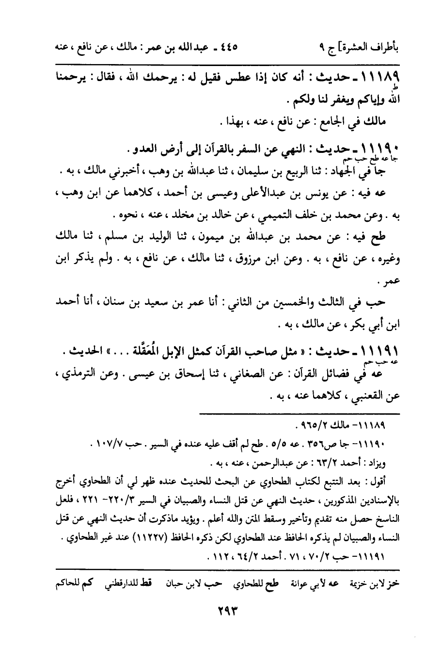11190 - حَدِيثٌ (جا عه طح حب حم) : النَّهْيُ عَنِ السَّفَرِ بِالْقُرْآنِ إِلَى أَرْضِ الْعَدُوِّ. جا فِي الْجِهَادِ: ثنا الرَّبِيعُ بْنُ سُلَيْمَانَ، ثنا عَبْدُ اللَّهِ بْنُ وَهْبٍ، أَخْبَرَنِي مَالِكٌ، بِهِ. عه فِيهِ: عَنْ يُونُسَ بْنِ عَبْدِ الأَعْلَى، وَعِيسَى بْنِ أَحْمَدَ، كِلاهُمَا عَنِ ابْنِ وَهْبٍ، بِهِ. وَعَنْ مُحَمَّدِ بْنِ خَلَفٍ التَّمِيمِيِّ، عَنْ خَالِدِ بْنِ مَخْلَدٍ، عَنْهُ، نَحْوَهُ. طح فِيهِ: عَنْ مُحَمَّدِ بْنِ عَبْدِ اللَّهِ بْنِ مَيْمُونٍ، ثنا الْوَلِيدُ بْنُ مُسْلِمٍ، ثنا مَالِكٌ، وَغَيْرُهُ، عَنْ نَافِعٍ، بِهِ. وَعَنِ ابْنِ مَرْزُوقٍ، ثنا مَالِكٌ، عَنْ نَافِعٍ، بِهِ. وَلَمْ يَذْكُرِ ابْنُ عُمَرَ. حب فِي الثَّالِثِ وَالْخَمْسِينَ مِنَ الثَّانِي: أَنَا عُمَرُ بْنُ سَعِيدِ بْنِ سِنَانٍ، أَنَا أَحْمَدُ بْنُ أَبِي بَكْرٍ، عَنْ مَالِكٍ، بِهِ.