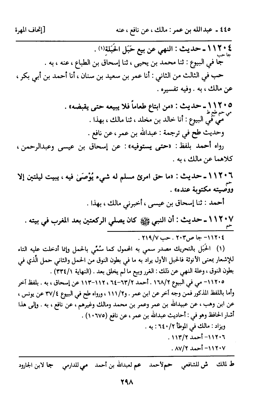 11205 - حَدِيثٌ (مي حم طح ط) : " مَنِ ابْتَاعَ طَعَامًا فَلا يَبِيعُهُ حَتَّى يَقْبِضَهُ ". مي فِي الْبُيُوعِ: أَنَا خَالِدُ بْنُ مَخْلَدٍ، ثنا مَالِكٌ، بِهَذَا. وَحَدِيثُ طح فِي تَرْجَمَةِ: عَبْدِ اللَّهِ بْنِ عُمَرَ، عَنْ نَافِعٍ. رَوَاهُ أَحْمَدُ بِلَفْظِ: " حَتَّى يَسْتَوْفِيَهُ ": عَنْ إِسْحَاقَ بْنِ عِيسَى، وَعَبْدِ الرَّحْمَنِ، كِلاهُمَا عَنْ مَالِكٍ، بِهِ.