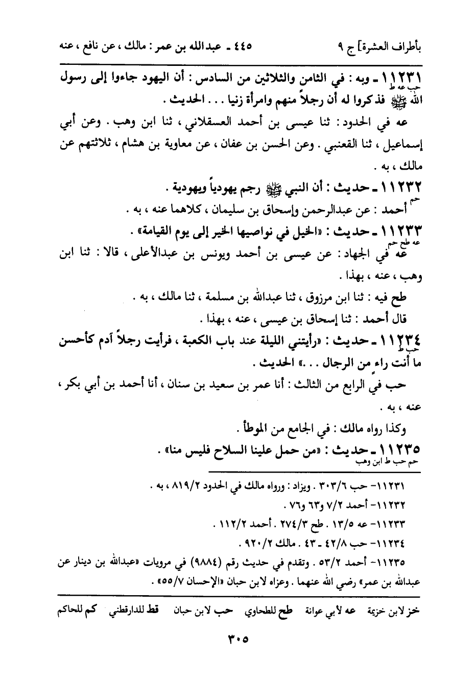 11231 - وَبِهِ (حب عه ط) : فِي الثَّامِنِ وَالثَّلاثِينَ مِنَ السَّادِسِ: أَنَّ الْيَهُودَ جَاءُوا إِلَى رَسُولِ اللَّهِ , صَلَّى اللَّهُ عَلَيْهِ وَسَلَّمَ، فَذَكَرُوا لَهُ أَنَّ رَجُلا مِنْهُمْ وَامْرَأَةً زَنَيَا ... الْحَدِيثَ. عه فِي الْحُدُودِ: ثنا عِيسَى بْنُ أَحْمَدَ الْعَسْقَلانِيُّ، ثنا ابْنُ وَهْبٍ. وَعَنْ أَبِي إِسْمَاعِيلَ، ثنا الْقَعْنَبِيُّ. وَعَنِ الْحَسَنِ بْنِ عَفَّانَ، عَنْ مُعَاوِيَةَ بْنِ هِشَامٍ، ثَلاثَتُهُمْ عَنْ مَالِكٍ، بِهِ.