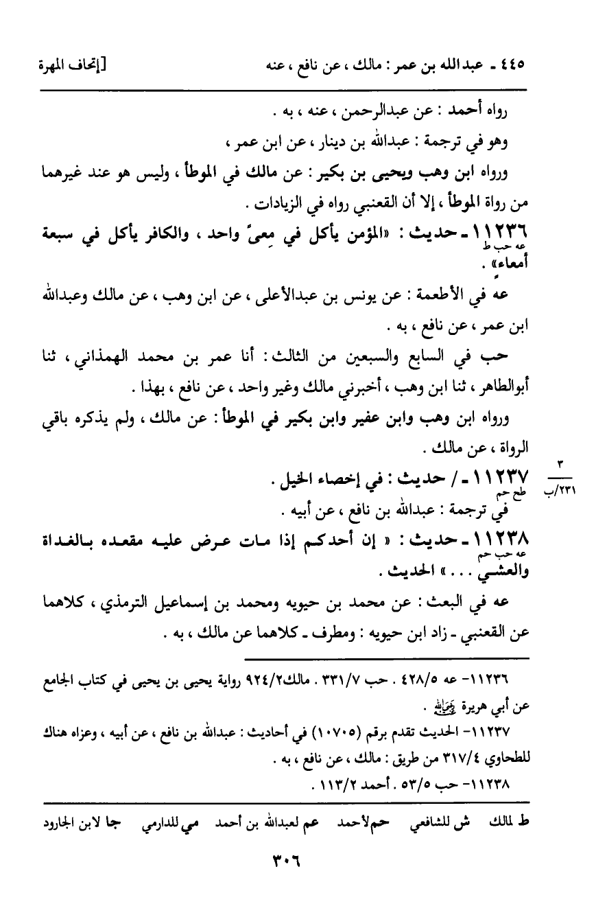 11236 - حَدِيثٌ (عه حب ط) : " الْمُؤْمِنُ يَأْكُلُ فِي مَعْيٍ وَاحِدٍ، وَالْكَافِرُ يَأْكُلُ فِي سَبْعَةِ أَمْعَاءٍ ". عه فِي الأَطْعِمَةِ: عَنْ يُونُسَ بْنِ عَبْدِ الأَعْلَى، عَنِ ابْنِ وَهْبٍ، عَنْ مَالِكٍ، وَعَبْدِ اللَّهِ بْنِ عُمَرَ، عَنْ نَافِعٍ، بِهِ. حب فِي السَّابِعِ وَالسَّبْعِينَ مِنَ الثَّالِثِ: أَنَا عُمَرُ بْنُ مُحَمَّدٍ الْهَمَذَانِيُّ، ثنا أَبُو الطَّاهِرِ، ثنا ابْنُ وَهْبٍ، أَخْبَرَنِي مَالِكٌ، وَغَيْرُ وَاحِدٍ، عَنْ نَافِعٍ بِهَذَا. وَرَوَاهُ ابْنُ وَهْبٍ، وَابْنُ عُفَيْرٍ، فِي (الْمُوَطَّإِ) : عَنْ مَالِكٍ، وَلَمْ يَذْكُرْهُ بَاقِي الرُّوَاةِ، عَنْ مَالِكٍ.