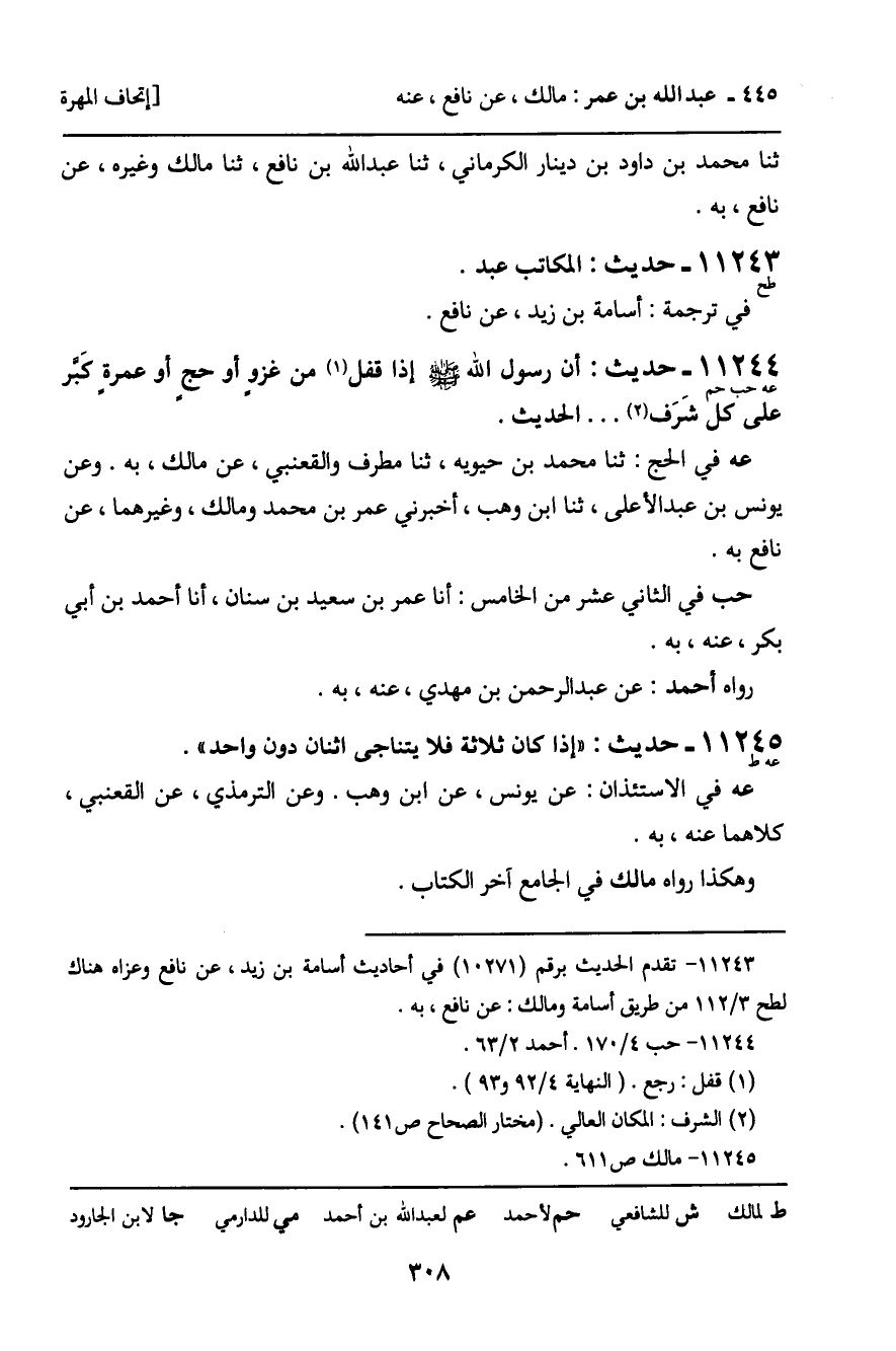 11244 - حَدِيثٌ (عه حب حم) : أَنَّ رَسُولَ اللَّهِ , صَلَّى اللَّهُ عَلَيْهِ وَسَلَّمَ، إِذَا قَفَلَ مِنْ غَزْوٍ أَوْ حَجٍّ أَوْ عُمْرَةً كَبَّرَ عَلَى كُلِّ شَرَفٍ ... الْحَدِيثَ. عه فِي الْحَجِّ: ثنا مُحَمَّدُ بْنُ حَيُّوَيْهِ، ثنا مُطَرِّفٌ وَالْقَعْنَبِيُّ، عَنْ مَالِكٍ، بِهِ. وَعَنْ يُونُسَ بْنِ عَبْدِ الأَعْلَى، ثنا ابْنُ وَهْبٍ، أَخْبَرَنِي عُمَرُ بْنُ مُحَمَّدٍ، وَمَالِكٌ، وَغَيْرُهُمَا، عَنْ نَافِعٍ بِهِ. حب فِي الثَّانِي عَشَرَ مِنَ الْخَامِسِ: أَنَا عُمَرُ بْنُ سَعِيدِ بْنِ سِنَانٍ، أَنَا أَحْمَدُ بْنُ أَبِي بَكْرٍ، عَنْهُ، بِهِ. رَوَاهُ أَحْمَدُ: عَنْ عَبْدِ الرَّحْمَنِ بْنِ مَهْدِيٍّ، عَنْهُ، بِهِ.