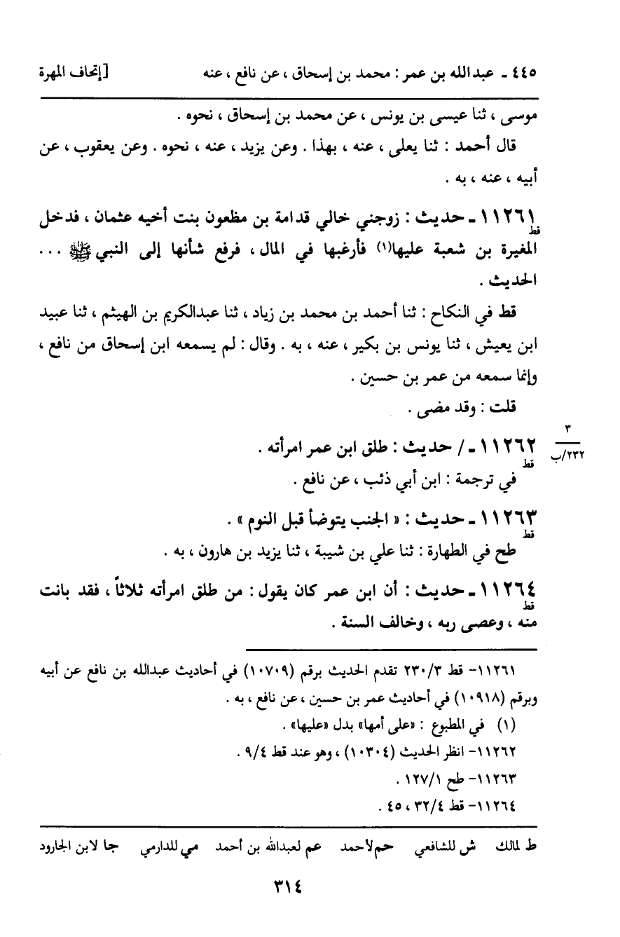-[315]- قط فِي الطَّلاقِ: ثنا ابْنُ مُبَشِّرٍ، ثنا أَحْمَدُ بْنُ سِنَانٍ، ثنا يَزِيدُ , هُوَ ابْنُ هَارُونَ، عَنْهُ، بِهَذَا. وَفِيهِ: عَنْ عُثْمَانَ بْنِ جَعْفَرٍ اللَّبَّانِ، وَأَبِي صَالِحٍ الأَصْبَهَانِيِّ، قَالا: ثنا مُحَمَّدُ بْنُ الْحَجَّاجِ بْنِ نَذِيرٍ، ثنا عَبْدُ الرَّحِيمِ بْنُ سُلَيْمَانَ، عَنِ ابْنِ إِسْحَاقَ، وَعُبَيْدِ اللَّهِ بْنِ عُمَرَ , فَرَّقَهُمَا، عَنْ نَافِعٍ، بِهِ.