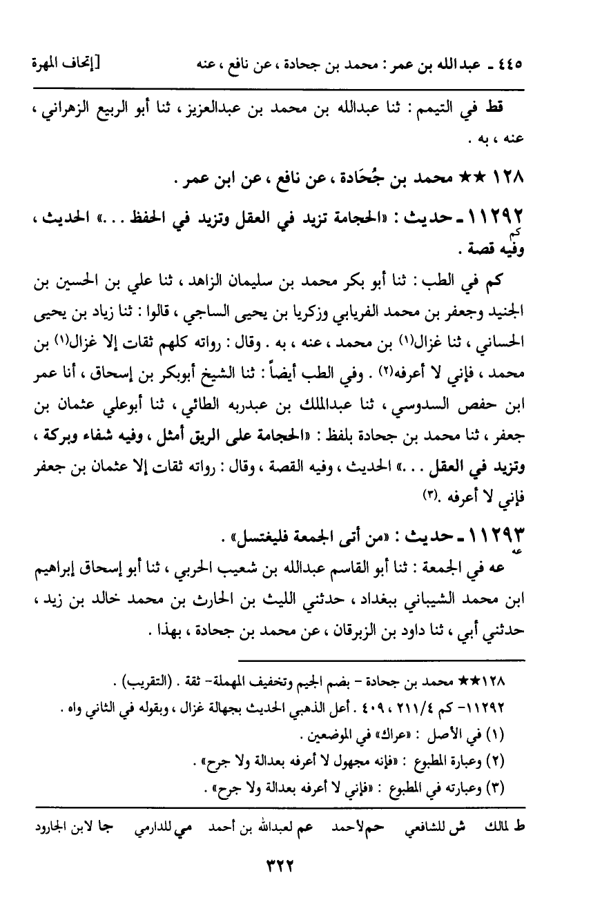 11292 - حَدِيثٌ (كم) : " الْحِجَامَةُ تَزِيدُ فِي الْعَقْلِ وَتَزِيدُ فِي الْحِفْظِ ... " الْحَدِيثَ، وَفِيهِ قِصَّةٌ. كم فِي الطِّبِّ: ثنا أَبُو بَكْرٍ مُحَمَّدُ بْنُ سُلَيْمَانَ الزَّاهِدُ، ثنا عَلِيُّ بْنُ الْحُسَيْنِ بْنِ الْجُنَيْدِ، وَجَعْفَرُ بْنُ مُحَمَّدٍ الْفِرْيَابِيُّ، وَزَكَرِيَّا بْنُ يَحْيَى السَّاجِيُّ، قَالُوا: ثنا زِيَادُ بْنُ يَحْيَى الْحَسَّانِيُّ، ثنا غَزَالُ بْنُ مُحَمَّدٍ، عَنْهُ، بِهِ. وَقَالَ: رُوَاتُهُ كُلُّهُمْ ثِقَاتٌ إِلا غَزَالَ بْنَ مُحَمَّدٍ، فَإِنِّي لا أَعْرِفُهُ. وَفِي الطِّبِّ أَيْضًا: ثنا الشَّيْخُ أَبُو بَكْرِ بْنُ إِسْحَاقَ، أَنَا عُمَرُ بْنُ حَفْصٍ السَّدُوسِيُّ، ثنا عَبْدُ الْمَلِكِ بْنُ عَبْدِ رَبِّهِ الطَّائِيُّ، ثنا أَبُو عَلِيٍّ عُثْمَانُ بْنُ جَعْفَرٍ، ثنا مُحَمَّدُ بْنُ جُحَادَةَ بِلَفْظِ: " الْحِجَامَةُ عَلَى الرِّيقِ أَمْثَلُ، وَفِيهِ شِفَاءٌ بَرَكَةٌ، وتَزِيدُ فِي الْعَقْلِ ... " الْحَدِيثَ، وَفِيهِ الْقِصَّةُ، وَقَالَ: رُوَاتُهُ ثِقَاتٌ إِلا عُثْمَانَ بْنَ جَعْفَرٍ فَإِنِّي لا أَعْرِفُهُ.