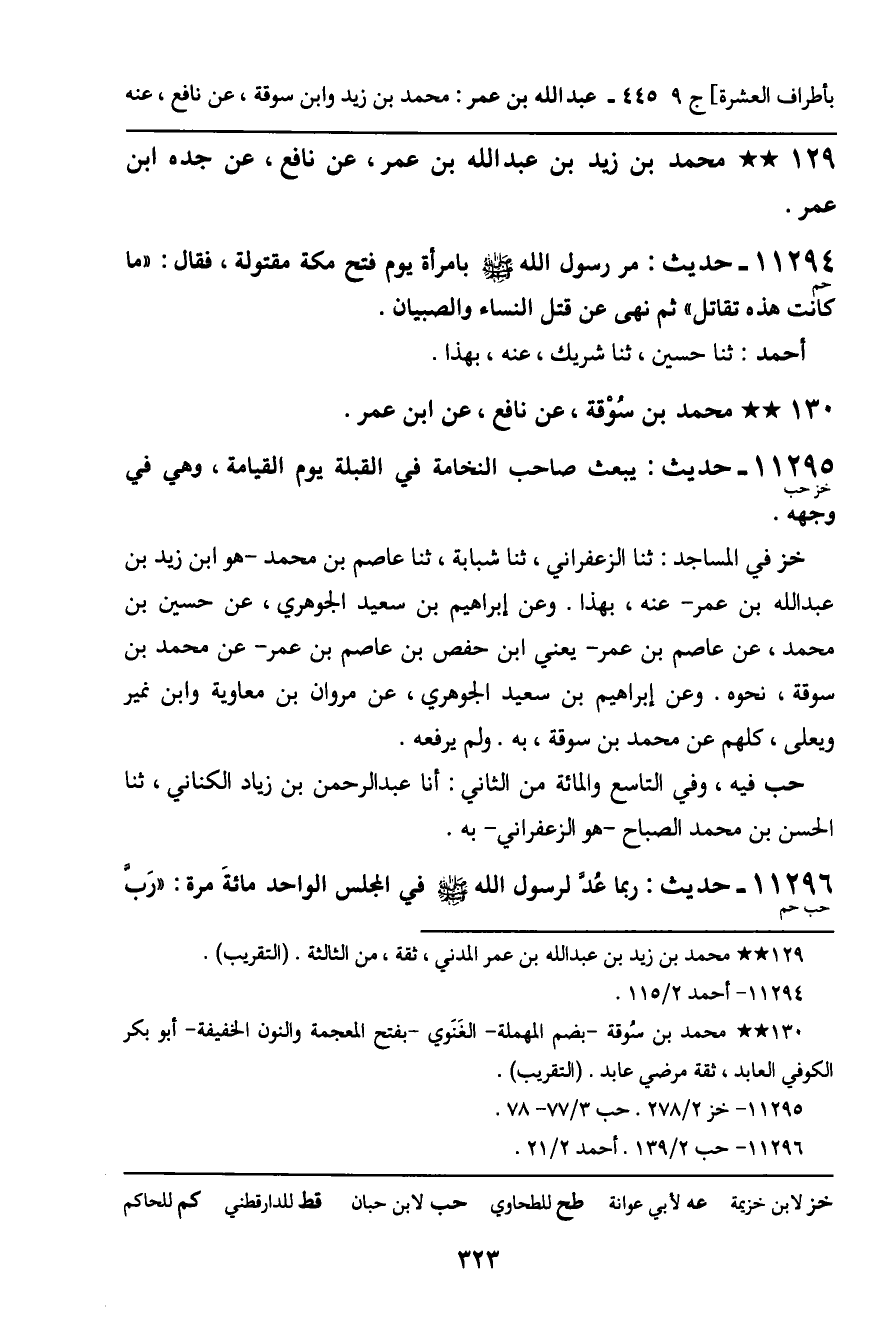 11295 - حَدِيثٌ (خز حب) : يُبْعَثُ صَاحِبُ النُّخَامَةِ فِي الْقِبْلَةِ يَوْمَ الْقِيَامَةِ، وَهِيَ فِي وَجْهِهِ. خز فِي الْمَسَاجِدِ: ثنا الزَّعْفَرَانِيُّ، ثنا شَبَابَةُ، ثنا عَاصِمُ بْنُ مُحَمَّدٍ , هُوَ ابْنُ زَيْدِ بْنِ عَبْدِ اللَّهِ بْنِ عُمَرَ، عَنْهُ، بِهَذَا. وَعَنْ إِبْرَاهِيمَ بْنِ سَعِيدٍ الْجَوْهَرِيِّ، عَنْ حُسَيْنِ بْنِ مُحَمَّدٍ، عَنْ عَاصِمِ بْنِ عُمَرَ , يَعْنِي: ابْنَ حَفْصِ بْنِ عَاصِمِ بْنِ عُمَرَ، عَنْ مُحَمَّدِ بْنِ سُوقَةَ، نَحْوَهُ. وَعَنْ إِبْرَاهِيمَ بْنِ سَعِيدٍ الْجَوْهَرِيِّ، عَنْ مَرْوَانَ بْنِ مُعَاوِيَةَ، وَابْنِ نُمَيْرٍ، وَيَعْلَى، كُلُّهُمْ عَنْ مُحَمَّدِ بْنِ سُوقَةَ، بِهِ. وَلَمْ يَرْفَعْهُ. حب فِيهِ، وَفِي التَّاسِعِ وَالْمِائَةِ مِنَ الثَّانِي: أَنَا عَبْدُ الرَّحْمَنِ بْنُ زِيَادٍ الْكِنَانِيُّ، ثنا الْحَسَنُ بْنُ مُحَمَّدٍ الصَّبَّاحُ , هُوَ الزَّعْفَرَانِيُّ، بِهِ.
