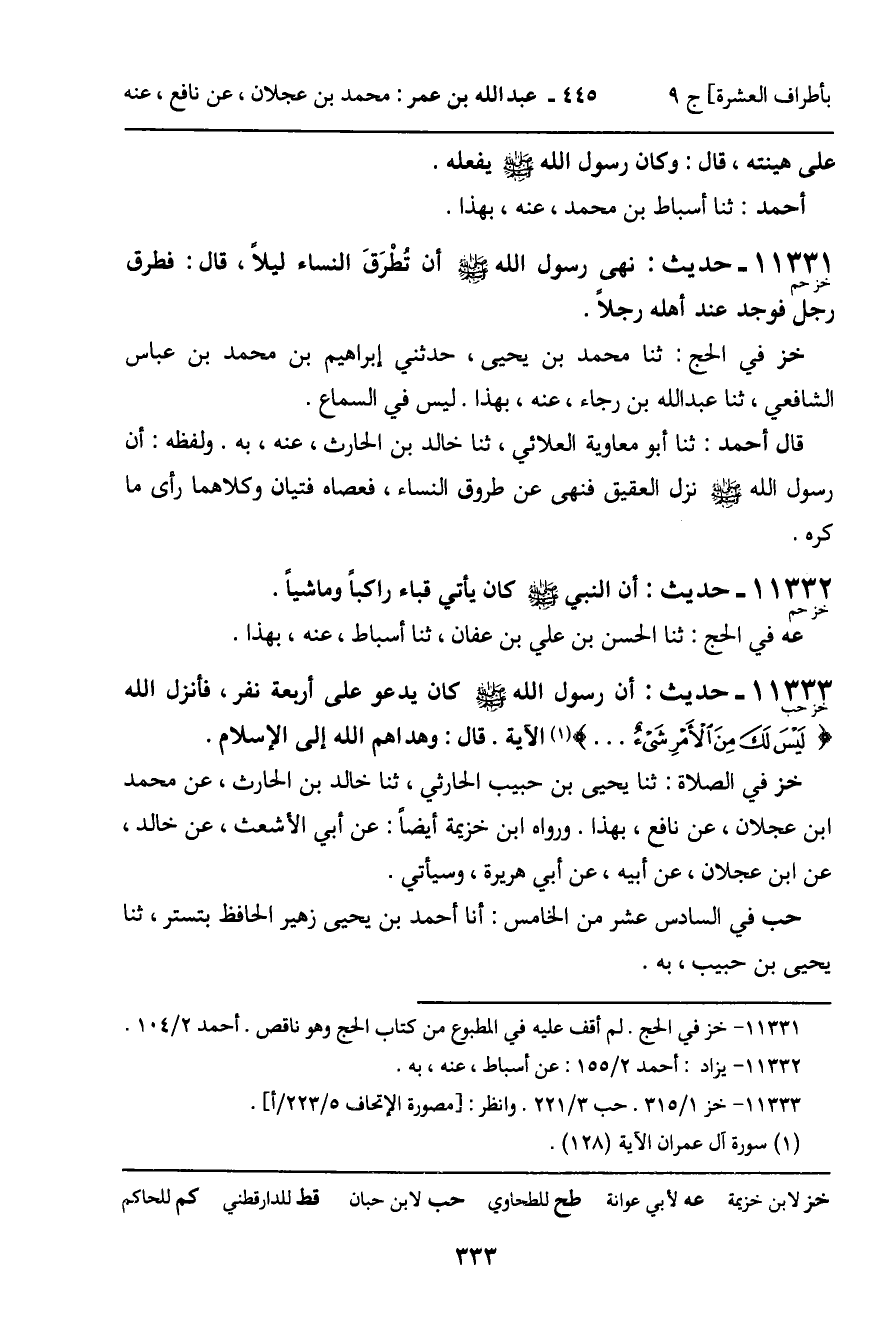 1133 - حَدِيثٌ (خز حب) : أَنَّ رَسُولَ اللَّهِ , صَلَّى اللَّهُ عَلَيْهِ وَسَلَّمَ، كَانَ يَدْعُو عَلَى أَرْبَعَةِ نَفَرٍ، فَأَنْزَلَ اللَّهُ: لَيْسَ لَكَ مِنَ الأَمْرِ شَيْءٌ [سورة: آل عمران، آية 128] الآيَةَ. قَالَ: وَهَدَاهُمُ اللَّهُ إِلَى الإِسْلامِ. خز فِي الصَّلاةِ: ثنا يَحْيَى بْنُ حَبِيبٍ الْحَارِثِيُّ، ثنا خَالِدُ بْنُ الْحَارِثِ، عَنْ مُحَمَّدِ بْنِ عَجْلانَ، عَنْ نَافِعٍ، بِهَذَا. وَرَوَاهُ ابْنُ خُزَيْمَةَ أَيْضًا: عَنْ أَبِي الأَشْعَثِ، عَنْ خَالِدٍ، عَنِ ابْنِ عَجْلانَ، عَنْ أَبِيهِ، عَنْ أَبِي هُرَيْرَةَ، وَسَيَأْتِي. حب فِي السَّادِسَ عَشَرَ مِنَ الْخَامِسِ: أَنَا أَحْمَدُ بْنُ يَحْيَى بْنِ زُهَيْرٍ الْحَافِظُ بِتُسْتَرَ، ثَنا يَحْيَى بْنُ حَبِيبٍ، بِهِ.