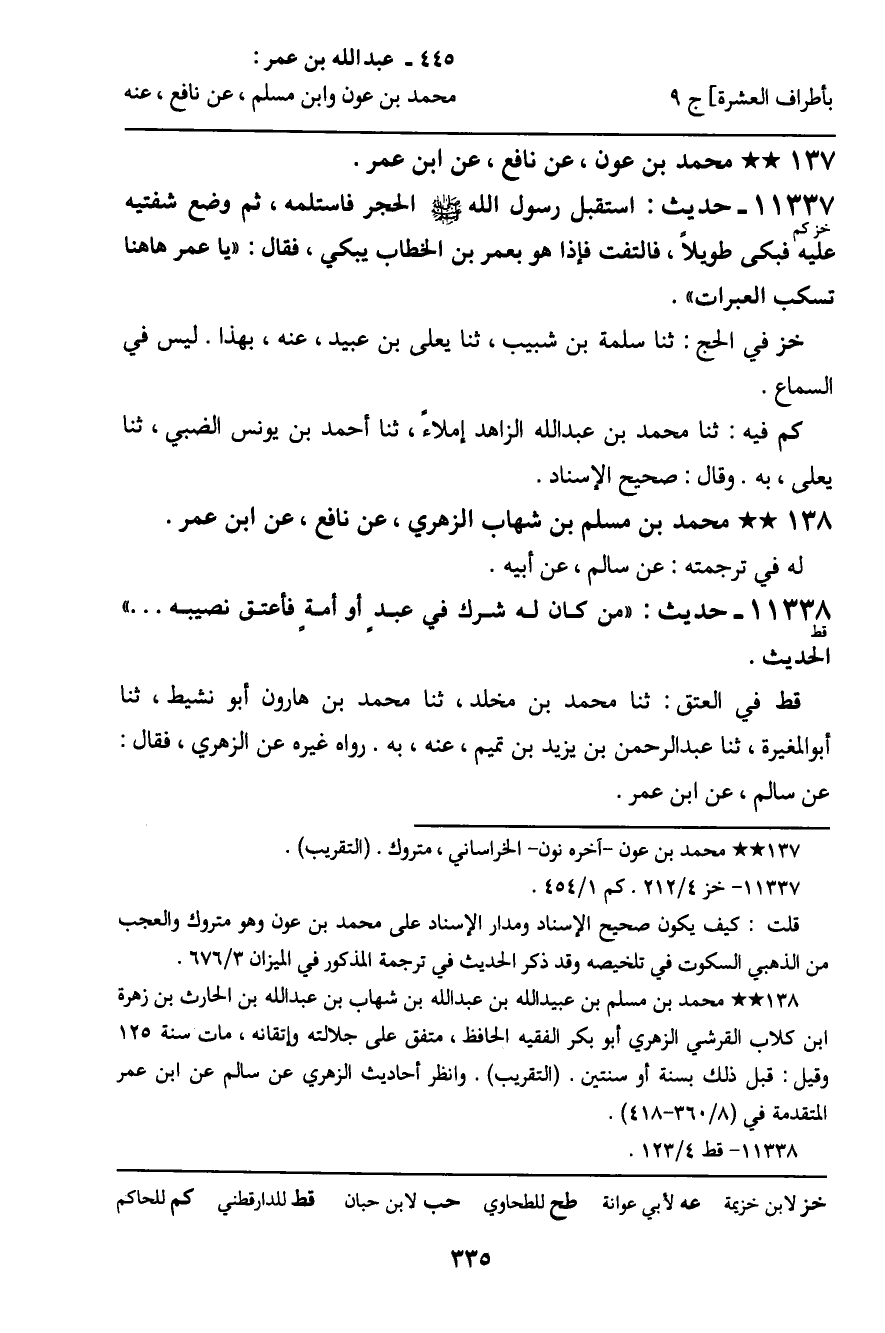 11337 - حَدِيثٌ (خز كم) : اسْتَقْبَلَ رَسُولُ اللَّهِ , صَلَّى اللَّهُ عَلَيْهِ وَسَلَّمَ، الْحَجَرَ فَاسْتَلَمَهُ، ثُمَّ وَضَعَ شَفَتَيْهِ عَلَيْهِ فَبَكَى طَوِيلا، فَالْتَفَتَ فَإِذَا هُوَ بِعُمَرَ بْنِ الْخَطَّابِ يَبْكِي، فَقَالَ: " يَا عُمَرُ , هَهُنَا تُسْكَبُ الْعَبَرَاتُ ". خز فِي الْحَجِّ: ثنا سَلَمَةُ بْنُ شَبِيبٍ، ثنا يَعْلَى بْنُ عُبَيْدٍ، عَنْهُ، بِهَذَا. لَيْسَ فِي السَّمَاعِ. كم فِيهِ: ثنا مُحَمَّدُ بْنُ عَبْدِ اللَّهِ الزَّاهِدُ , إِمْلاءً، ثنا أَحْمَدُ بْنُ يُونُسَ الضَّبِّيُّ، ثنا يَعْلَى، بِهِ. وَقَالَ: صَحِيحُ الإِسْنَادِ. مُحَمَّدُ بْنُ سَلْمِ بْنِ شِهَابٍ الزُّهْرِيُّ، عَنْ نَافِعٍ، عَنِ ابْنِ عُمَرَ. لَهُ فِي تَرْجَمَتِهِ: عَنْ سَالِمٍ، عَنْ أَبِيهِ.
