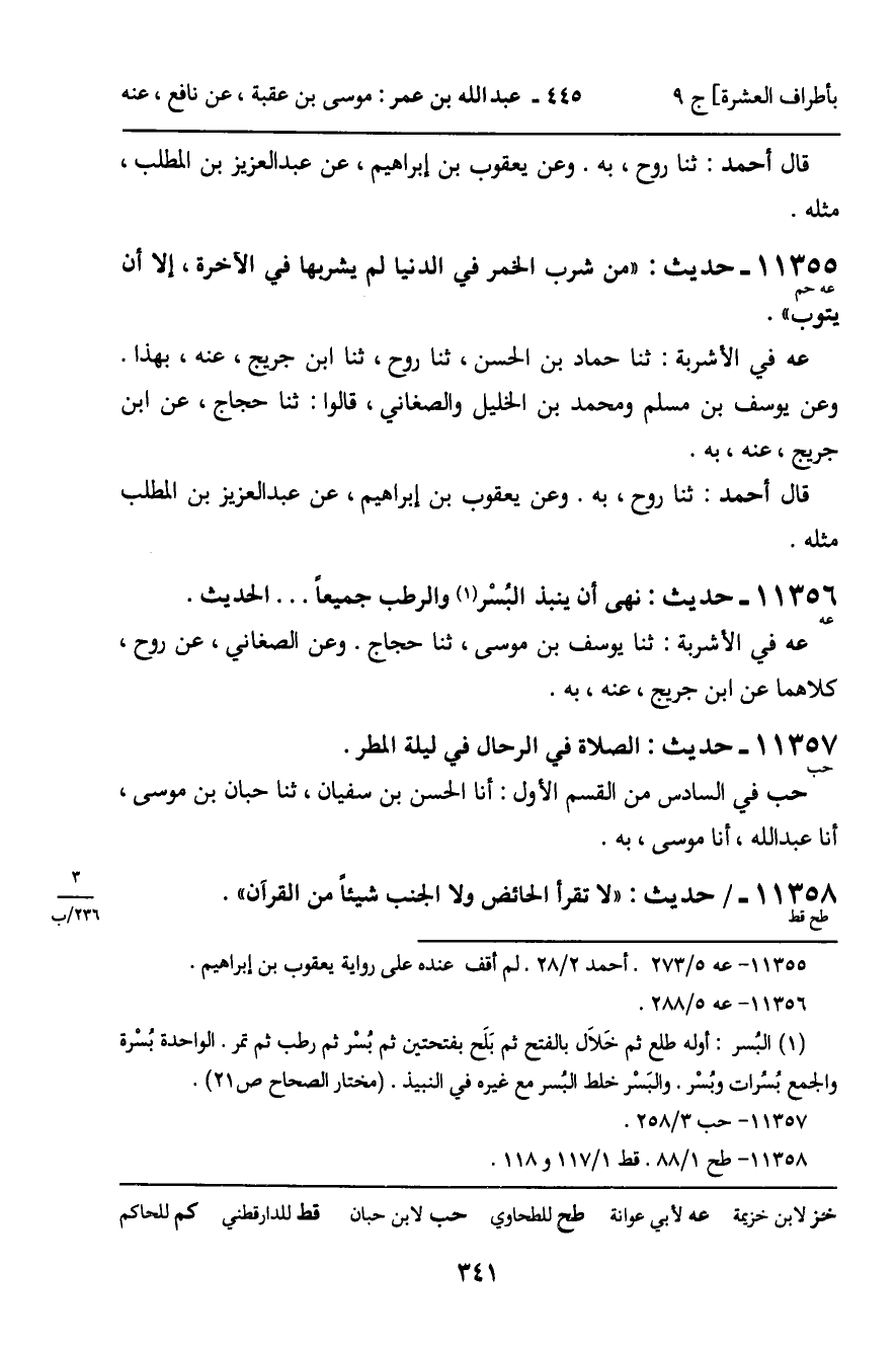 11355 - حَدِيثٌ (عه حم) : " مَنْ شَرِبَ الْخَمْرَ فِي الدُّنْيَا لَمْ يَشْرَبْهَا فِي الآخِرَةِ، إِلا أَنْ يَتُوبَ ". عه فِي الأَشْرِبَةِ: ثنا حَمَّادُ بْنُ الْحَسَنِ، ثنا رَوْحٌ، ثنا ابْنُ جُرَيْجٍ، عَنْهُ، بِهَذَا. وَعَنْ يُوسُفَ بْنِ مُسَلَّمٍ، وَمُحَمَّدِ بْنِ الْخَلِيلِ، وَالصَّغَانِيِّ، قَالُوا: ثنا حَجَّاجٌ، عَنِ ابْنِ جُرَيْجٍ، عَنْهُ، بِهِ. قَالَ أَحْمَدُ: ثنا رَوْحٌ، بِهِ. وَعَنْ يَعْقُوبَ بْنِ إِبْرَاهِيمَ، عَنْ عَبْدِ الْعَزِيزِ بْنِ الْمُطَّلِبِ مِثْلَهُ.