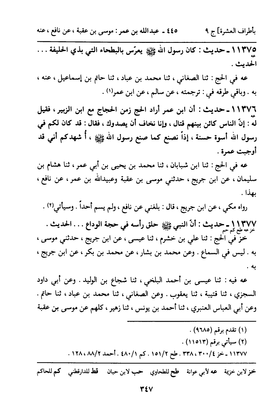 11377 - حَدِيثٌ (خز عه طح كم حم) : أَنَّ النَّبِيَّ , صَلَّى اللَّهُ عَلَيْهِ وَسَلَّمَ، حَلَقَ رَأْسَهُ فِي حَجَّةِ الْوَدَاعِ ... الْحَدِيثَ. خز فِي الْحَجِّ: ثنا عَلِيُّ بْنُ خَشْرَمٍ، ثنا عِيسَى، عَنِ ابْنِ جُرَيْجٍ، حَدَّثَنِي مُوسَى، بِهِ. لَيْسَ فِي السَّمَاعِ. وَعَنْ مُحَمَّدِ بْنِ بَشَّارٍ، عَنْ مُحَمَّدِ بْنِ بَكْرٍ، عَنِ ابْنِ جُرَيْجٍ، بِهِ. عه فِيهِ: ثنا عِيسَى بْنُ أَحْمَدَ الْبَلْخِيُّ، ثنا شُجَاعُ بْنُ الْوَلِيدِ. وَعَنْ أَبِي دَاوُدَ السِّجْزِيِّ، ثَنا قُتَيْبَةُ، ثنا يَعْقُوبُ. وَعَنِ الصَّغَانِيِّ، ثنا مُحَمَّدُ بْنُ عَبَّادٍ، ثنا حَاتِمٌ. وَعَنْ أَبِي الْعَبَّاسِ الْعَنْبَرِيِّ، ثنا أَحْمَدُ بْنُ يُونُسَ، ثنا زُهَيْرٌ، كُلُّهُمْ عَنْ مُوسَى بْنِ عُقْبَةَ