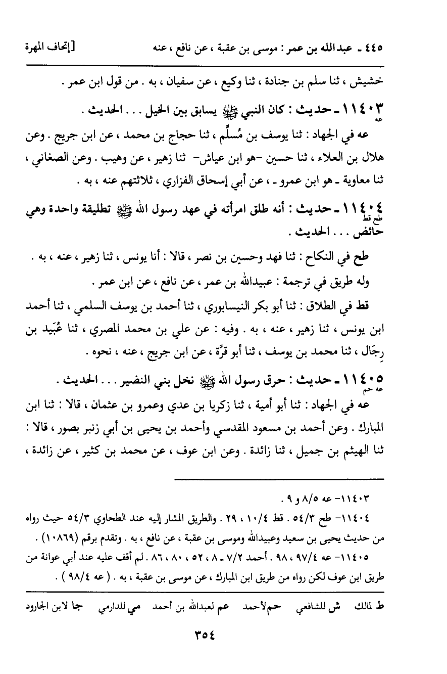 11403 - حَدِيثٌ (عه) : كَانَ النَّبِيُّ , صَلَّى اللَّهُ عَلَيْهِ وَسَلَّمَ، يُسَابِقُ بَيْنَ الْخَيْلِ ... الْحَدِيثَ. عه فِي الْجِهَادِ: ثنا يُوسُفُ بْنُ مُسَلَّمٍ، ثنا حَجَّاجُ بْنُ مُحَمَّدٍ، عَنِ ابْنِ جُرَيْجٍ. وَعَنْ هِلالِ بْنِ الْعَلاءِ، ثنا حُسَيْنٌ , هُوَ ابْنُ عَيَّاشٍ، ثنا زُهَيْرٌ، عَنْ وُهَيْبٍ. وَعَنِ الصَّغَانِيِّ، ثنا مُعَاوِيَةُ , هُوَ ابْنُ عَمْرٍو، عَنْ أَبِي إِسْحَاقَ الْفَزَارِيِّ، ثَلاثَتُهُمْ عَنْهُ، بِهِ.
