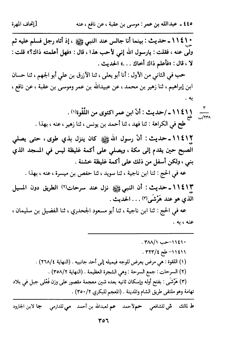 11413 - حَدِيثٌ (عه) : أَنَّ النَّبِيَّ , صَلَّى اللَّهُ عَلَيْهِ وَسَلَّمَ، نَزَلَ عِنْدَ سَرَحَاتِ الطَّرِيقِ دُونَ الْمَسِيلِ الَّذِي هُوَ عِنْدَ هَرْشَى ... الْحَدِيثَ. عه فِي الْحَجِّ: ثنا ابْنُ نَاجِيَةَ، ثنا أَبُو مَسْعُودٍ الْجَحْدَرِيُّ، ثنا الْفُضَيْلُ بْنُ سُلَيْمَانَ، عَنْهُ، بِهِ.