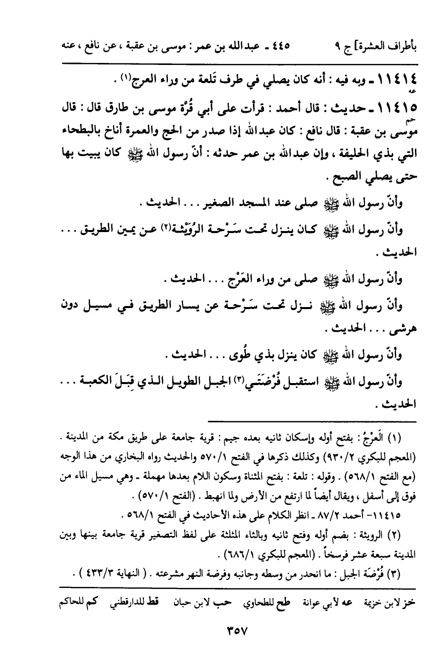 11415 - وَأَنَّ رَسُولَ اللَّهِ , صَلَّى اللَّهُ عَلَيْهِ وَسَلَّمَ، كَانَ يَنْزِلُ تَحْتَ سَرْحَةِ الرُّوَيْثَةِ عَنْ يَمِينِ الطَّرِيقِ ... الْحَدِيثَ.
