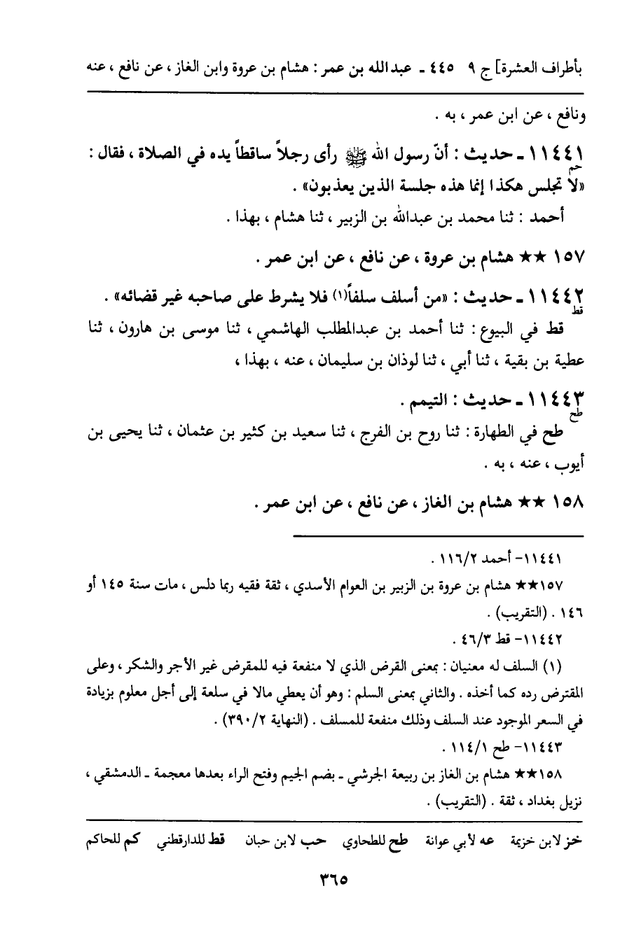 11442 - هِشَامُ بْنُ عُرْوَةَ، عَنْ نَافِعٍ، عَنِ ابْنِ عُمَرَ. حَدِيثٌ (قط) : " مَنْ أَسْلَفَ سَلَفًا فَلا يَشْرُطْ عَلَى صَاحِبِهِ غَيْرَ قَضَائِهِ ". قط فِي الْبُيُوعِ: ثنا أَحْمَدُ بْنُ عَبْدِ الْمُطَّلِبِ الْهَاشِمِيُّ، ثنا مُوسَى بْنُ هَارُونَ، ثنا عَطِيَّةُ بْنُ بَقِيَّةَ، ثنا أَبِي، ثنا لَوْذَانُ بْنُ سُلَيْمَانَ، عَنْهُ، بِهَذَا.