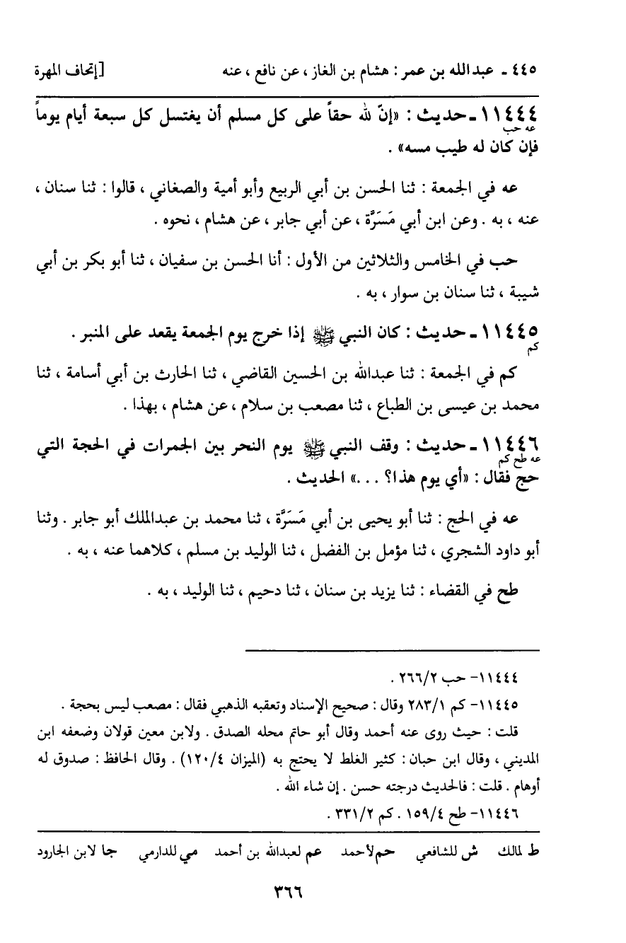 11446 - حَدِيثٌ (عه طح كم) : وَقَفَ النَّبِيُّ , صَلَّى اللَّهُ عَلَيْهِ وَسَلَّمَ، يَوْمَ النَّحْرِ بَيْنَ الْجَمَرَاتِ فِي الْحَجَّةِ الَّتِي حَجَّ , فَقَالَ: " أَيُّ يَوْمٍ هَذَا؟ ... " الْحَدِيثَ. عه فِي الْحَجِّ: ثنا أَبُو يَحْيَى بْنُ أَبِي مَسَرَّةَ، ثنا مُحَمَّدُ بْنُ عَبْدِ الْمَلِكِ أَبُو جَابِرٍ. وثنا أَبُو دَاوُدَ الْحَرَّانِيُّ، ثنا مُؤَمَّلُ بْنُ الْفَضْلِ، ثنا الْوَلِيدُ بْنُ مُسْلِمٍ، كِلاهُمَا عَنْهُ، بِهِ. طح فِي الْقَضَاءِ: ثنا يَزِيدُ بْنُ سِنَانٍ، ثنا دُحَيْمٌ، ثنا الْوَلِيدُ، بِهِ.