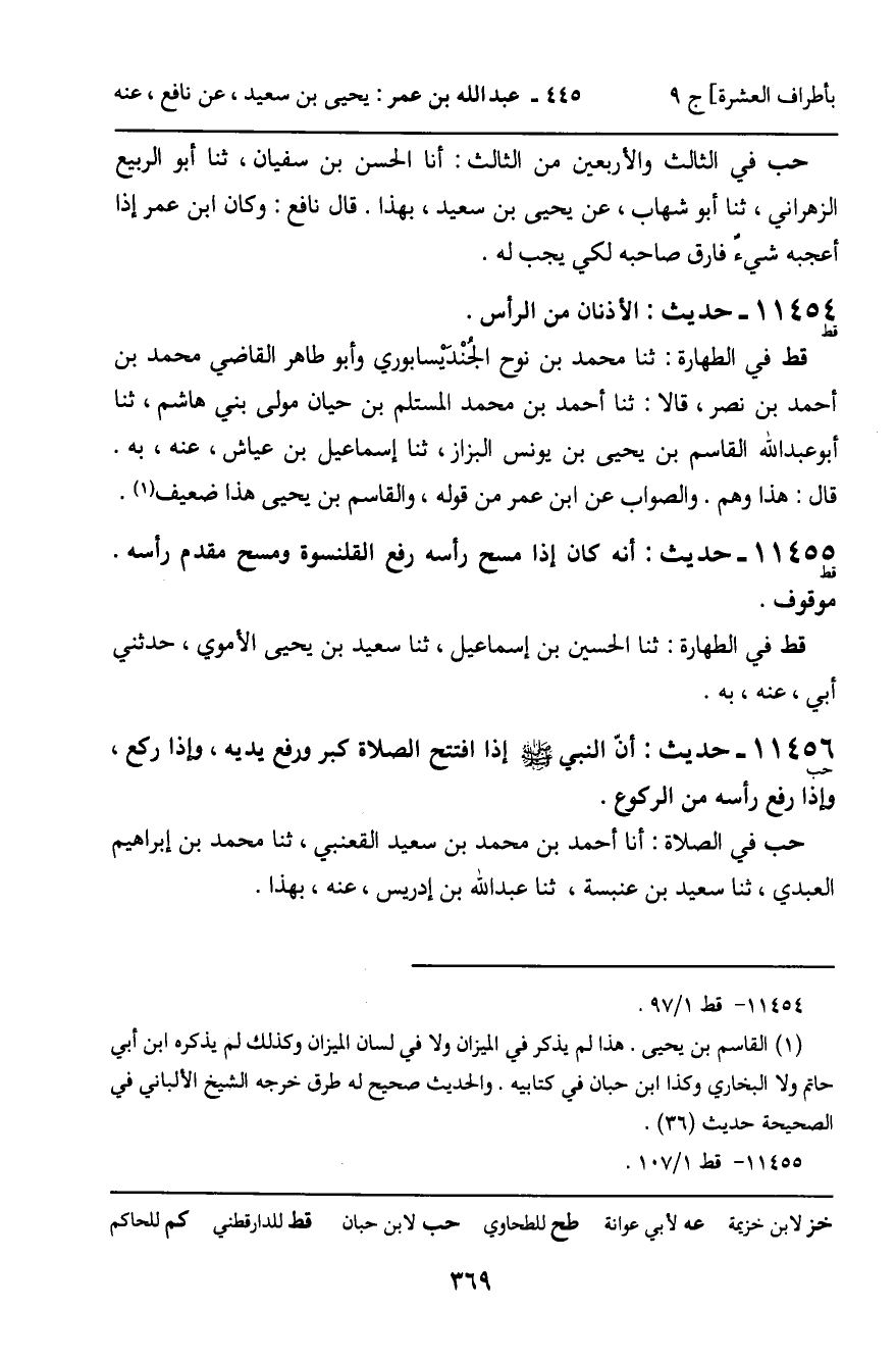 11454 - حَدِيثٌ (قط) : الأُذُنَانِ مِنَ الرَّأْسِ. قط فِي الطَّهَارَةِ: ثنا مُحَمَّدُ بْنُ نُوحٍ الْجُنْدِيسَابُورِيُّ، وَأَبُو طَاهِرٍ الْقَاضِي مُحَمَّدُ بْنُ أَحْمَدَ بْنِ نَصْرٍ، قَالا: ثنا أَحْمَدُ بْنُ مُحَمَّدٍ الْمُسْتَلِمُ بْنُ حَيَّانَ , مَوْلَى بَنِي هَاشِمٍ، ثنا أَبُو عَبْدِ اللَّهِ الْقَاسِمُ بْنُ يَحْيَى بْنِ يُونُسَ الْبَزَّازُ، ثنا إِسْمَاعِيلُ بْنُ عَيَّاشٍ، عَنْهُ، بِهِ. قَالَ: هَذَا وَهْمٌ. وَالصَّوَابُ: عَنِ ابْنِ عُمَرَ مِنْ قَوْلِهِ، وَالْقَاسِمُ بْنُ يَحْيَى هَذَا ضَعِيفٌ.