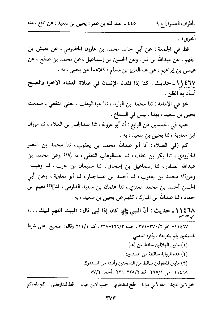 11467 - حَدِيثٌ (خز حب كم) : كُنَّا إِذَا فَقَدْنَا الإِنْسَانَ فِي صَلاةِ الْعِشَاءِ الآخِرَةِ وَالصُّبْحِ أَسَأْنَا بِهِ الظَّنَّ. خز فِي الإِمَامَةِ: ثنا مُحَمَّدُ بْنُ الْوَلِيدِ، ثنا عَبْدُ الْوَهَّابِ , يَعْنِي: الثَّقَفِيَّ، سَمِعْتُ يَحْيَى بْنَ سَعِيدٍ، بِهَذَا. لَيْسَ فِي السَّمَاعِ. حب فِي الْخَمْسِينَ مِنَ الرَّابِعِ: أَنَا أَبُو عَرُوبَةَ، ثنا عَبْدُ الْجَبَّارِ بْنُ الْعَلاءِ، ثنا مَرْوَانُ بْنُ مُعَاوِيَةَ، ثنا يَحْيَى بْنُ سَعِيدٍ، بِهِ. كم فِي الصَّلاةِ: أَنَا أَبُو عَبْدِ اللَّهِ مُحَمَّدُ بْنُ يَعْقُوبَ، ثنا مُحَمَّدُ بْنُ النَّضْرِ الْجَارُودِيُّ، ثنا بَكْرُ بْنُ خَلَفٍ، ثنا عَبْدُ الْوَهَّابِ الثَّقَفِيُّ، بِهِ. وَعَنْ مُحَمَّدِ بْنِ عَبْدِ اللَّهِ الصَّفَّارِ، ثنا إِسْمَاعِيلُ بْنُ إِسْحَاقَ، ثنا سُلَيْمَانُ بْنُ حَرْبٍ، ثنا وُهَيْبٌ. وَعَنْ مُحَمَّدِ بْنِ يَعْقُوبَ، ثنا أَحْمَدُ بْنُ عَبْدِ الْجَبَّارِ، ثنا أَبُو مُعَاوِيَةَ. عَنْ أَبِي الْحَسَنِ أَحْمَدَ بْنِ مُحَمَّدٍ الْعَنزِيِّ، ثنا عُثْمَانُ بْنُ سَعِيدٍ الدَّارِمِيُّ، ثنا نُعَيْمُ بْنُ حَمَّادٍ، ثنا عَبْدُ اللَّهِ بْنُ الْمُبَارَكِ، كُلُّهُمْ عَنْ يَحْيَى بْنِ سَعِيدٍ، بِهِ.