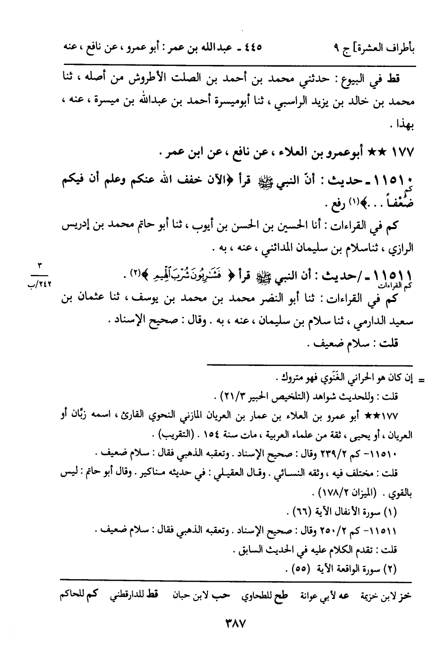 11510 - حَدِيثٌ (كم) : أَنَّ النَّبِيَّ , صَلَّى اللَّهُ عَلَيْهِ وَسَلَّمَ , قَرَأَ: الآنَ خَفَّفَ اللَّهُ عَنْكُمْ وَعَلِمَ أَنَّ فِيكُمْ ضُعْفًا رَفَعَ. كم فِي الْقِرَاءَاتِ: أَنَا الْحُسَيْنُ بْنُ الْحَسَنِ بْنِ أَيُّوبَ، ثنا أَبُو حَاتِمٍ مُحَمَّدُ بْنُ إِدْرِيسَ الرَّازِيُّ، ثنا سَلامُ بْنُ سُلَيْمَانَ الْمَدَائِنِيُّ، عَنْهُ، بِهِ.
