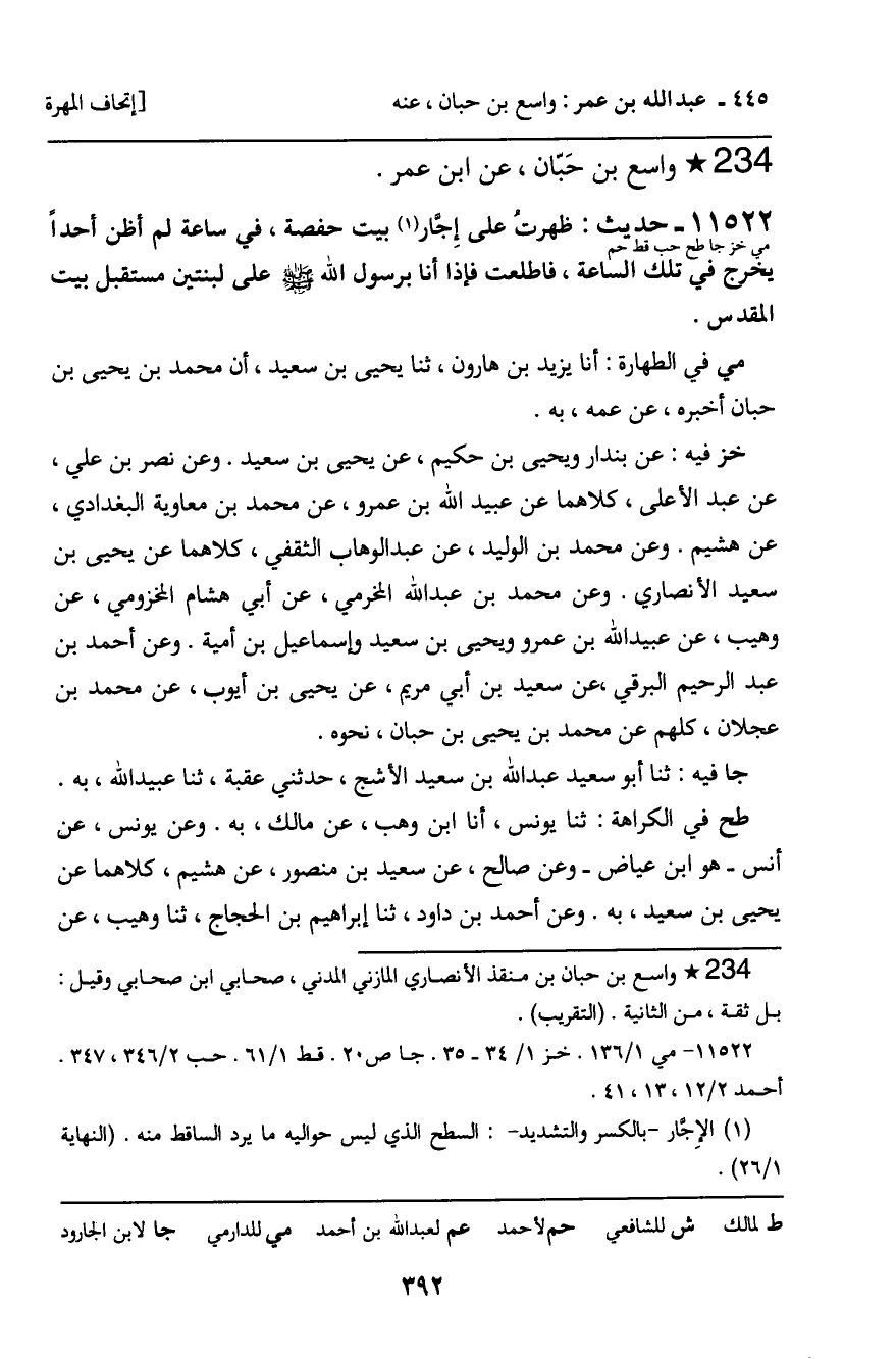 11522 - وَاسِعُ بْنُ حَبَّانَ، عَنِ ابْنِ عُمَرَ. حَدِيثٌ (مي خز جا طح حب قط حم) : ظَهَرْتُ عَلَى إِجَّارِ بَيْتِ حَفْصَةَ، فِي سَاعَةٍ لَمْ أَظُنَّ أَحَدًا يَخْرُجُ فِي تِلْكَ السَّاعَةِ، فَاطَّلَعْتُ فَإِذَا أَنَا بِرَسُولِ اللَّهِ , صَلَّى اللَّهُ عَلَيْهِ وَسَلَّمَ، عَلَى لَبِنَتَيْنِ مُسْتَقْبِلَ بَيْتِ الْمَقْدِسِ. مي فِي الطَّهَارَةِ: أَنَا يَزِيدُ بْنُ هَارُونَ، ثنا يَحْيَى بْنُ سَعِيدٍ، أَنَّ مُحَمَّدَ بْنَ يَحْيَى بْنِ حَبَّانَ أَخْبَرَهَ، عَنْ عَمِّهِ، بِهِ. خز فِيهِ: عَنْ بُنْدَارٍ، وَيَحْيَى بْنِ حَكِيمٍ، عَنْ يَحْيَى بْنِ سَعِيدٍ. وَعَنْ نَصْرِ بْنِ عَلِيٍّ، عَنْ عَبْدِ الأَعْلَى، كِلاهُمَا عَنْ عُبَيْدِ اللَّهِ بْنِ عَمْرٍو، عَنْ مُحَمَّدِ بْنِ مُعَاوِيَةَ الْبَغْدَادِيِّ، عَنْ هُشَيْمٍ. وَعَنْ مُحَمَّدِ بْنِ الْوَلِيدِ، عَنْ عَبْدِ الْوَهَّابِ الثَّقَفِيِّ، كِلاهُمَا عَنْ يَحْيَى بْنِ سَعِيدٍ الأَنْصَارِيِّ. وَعَنْ مُحَمَّدِ بْنِ عَبْدِ اللَّهِ الْمُخَرِمِّيِّ، عَنْ أَبِي هِشَامٍ الْمَخْزُومِيِّ، عَنْ وُهَيْبٍ، عَنْ عُبَيْدِ اللَّهِ بْنِ عَمْرٍو، وَيَحْيَى بْنِ سَعِيدٍ، وَإِسْمَاعِيلَ بْنِ أُمَيَّةَ. وَعَنْ أَحْمَدَ بْنِ عَبْدِ الرَّحِيمِ الْبَرْقِيِّ، عَنْ سَعِيدِ بْنِ أَبِي مَرْيَمَ، عَنْ يَحْيَى بْنِ أَيُّوبَ، عَنْ مُحَمَّدِ بْنِ عَجْلانَ، كُلُّهُمْ عَنْ مُحَمَّدِ بْنِ يَحْيَى بْنِ حَبَّانَ، نَحْوَهُ. جا فِيهِ: ثنا أَبُو سَعِيدٍ عَبْدُ اللَّهِ بْنُ سَعِيدٍ الأَشَجُّ، حَدَّثَنِي عُقْبَةُ، ثَنا عُبَيْدُ اللَّهِ، بِهِ. طح فِي الْكَرَاهَةِ: ثنا يُونُسُ، أَنَا ابْنُ وَهْبٍ، عَنْ مَالِكٍ، بِهِ. وَعَنْ يُونُسَ، عَنْ أَنَسٍ , هُوَ ابْنُ عِيَاضٍ، وَعَنْ صَالِحٍ، عَنْ سَعِيدِ بْنِ مَنْصُورٍ، عَنْ هُشَيْمٍ، كِلاهُمَا عَنْ يَحْيَى بْنِ سَعِيدٍ، بِهِ. وَعَنْ أَحْمَدَ بْنِ دَاوُدَ، ثنا إِبْرَاهِيمُ بْنُ الْحَجَّاجِ، ثنا وُهَيْبٌ، عَنْ