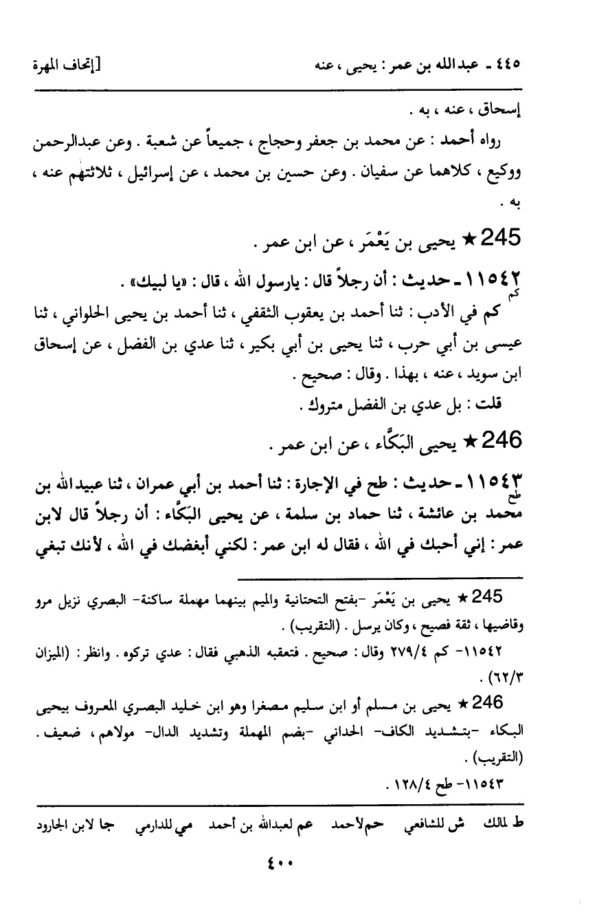 11542 - يَحْيَى بْنُ يَعْمَرَ، عَنِ ابْنِ عُمَرَ. حَدِيثٌ (كم) : أَنَّ رَجُلا قَالَ: يَا رَسُولَ اللَّهِ، قَالَ: " يَا لَبَّيْكَ ". كم فِي الأَدَبِ: ثنا أَحْمَدُ بْنُ يَعْقُوبَ الثَّقَفِيُّ، ثنا أَحْمَدُ بْنُ يَحْيَى الْحُلْوَانِيُّ، ثنا عِيسَى بْنُ أَبِي حَرْبٍ، ثنا يَحْيَى بْنُ أَبِي بُكَيْرٍ، ثنا عَدِيُّ بْنُ الْفَضْلِ، عَنْ إِسْحَاقَ بْنِ سُوَيْدٍ، عَنْهُ، بِهَذَا , وَقَالَ: صَحِيحٌ. قُلْتُ: بَلْ عَدِيُّ بْنُ الْفَضْلِ مَتْرُوكٌ.