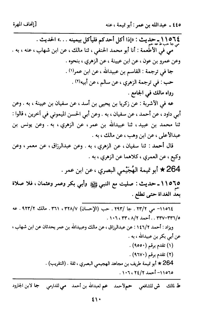 11564 - حَدِيثٌ (مي جا حب ط عه حم) : " إِذَا أَكَلَ أَحَدُكُمْ فَلْيَأْكُلْ بِيَمِينِهِ ... " الْحَدِيثَ. مي فِي الأَطْعِمَةِ: أَنَا أَبُو مُحَمَّدٍ الْحَنَفِيُّ، ثنا مَالِكٌ، عَنِ ابْنِ شِهَابٍ، عَنْهُ، بِهِ. وَعَنْ عَمْرِو بْنِ عَوْنٍ، عَنِ ابْنِ عُيَيْنَةَ، عَنِ الزُّهْرِيِّ، بِنَحْوِهِ. جا فِي تَرْجَمَةِ: الْقَاسِمِ بْنِ عُبَيْدِ اللَّهِ، عَنِ ابْنِ عُمَرَ. حب فِي تَرْجَمَةِ: الزُّهْرِيِّ، عَنْ سَالِمٍ، عَنْ أَبِيهِ. رَوَاهُ مَالِكٌ فِي الْجَامِعِ. عه فِي الأَشْرِبَةِ: عَنْ زَكَرِيَّا بْنِ يَحْيَى بْنِ أَسَدٍ، عَنْ سُفْيَانَ بْنِ عُيَيْنَةَ، بِهِ. وَعَنْ أَبِي دَاوُدَ، عَنْ أَحْمَدَ، عَنْ سُفْيَانَ، بِهِ. وَعَنْ أَبِي الْحَسَنِ الْمَيْمُونِيِّ فِي آخَرِينَ، قَالُوا: ثنا مُحَمَّدُ بْنُ عُبَيْدٍ، ثنا عُبَيْدُ اللَّهِ بْنُ عُمَرَ، عَنِ الزُّهْرِيِّ، بِهِ. وَعَنْ يُونُسَ بْنِ عَبْدِ الأَعْلَى، عَنِ ابْنِ وَهْبٍ، عَنْ مَالِكٍ، بِهِ. قَالَ أَحْمَدُ: ثنا سُفْيَانُ، عَنِ الزُّهْرِيِّ، بِهِ. وَعَنْ عَبْدِ الرَّزَّاقِ، عَنْ مَعْمَرٍ، وَعَنْ وَكِيعٍ، عَنِ الْعُمَرِيِّ، كِلاهُمَا عَنِ الزُّهْرِيِّ، بِهِ.
