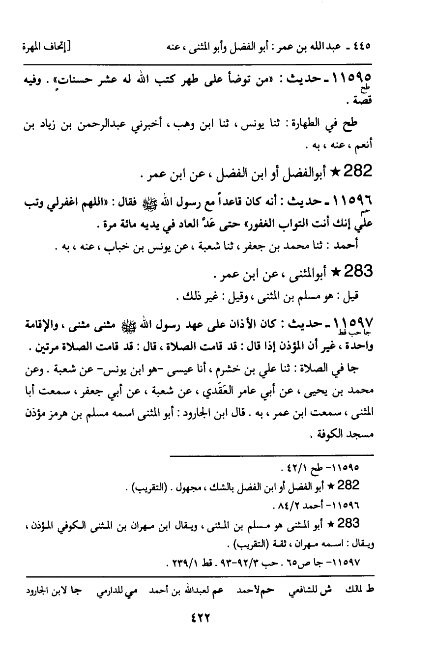 11597 - حَدِيثٌ (جا حب قط) : كَانَ الأَذَانُ عَلَى عَهْدِ رَسُولِ اللَّهِ , صَلَّى اللَّهُ عَلَيْهِ وَسَلَّمَ، مَثْنًى مَثْنًى، وَالإِقَامَةُ وَاحِدَةٌ، غَيْرَ أَنَّ الْمُؤَذِّنَ إِذَا قَالَ: قَدْ قَامَتِ الصَّلاةُ، قَالَ: قَدْ قَامَتِ الصَّلاةُ مَرَّتَيْنِ. جا فِي الصَّلاةِ: ثنا عَلِيُّ بْنُ خَشْرَمٍ، أَنَا عِيسَى , هُوَ ابْنُ يُونُسَ، عَنْ شُعْبَةَ. وَعَنْ مُحَمَّدِ بْنِ يَحْيَى، عَنْ أَبِي عَامِرٍ الْعَقَدِيِّ، عَنْ شُعْبَةَ، عَنْ أَبِي جَعْفَرٍ، سَمِعْتُ أَبَا الْمُثَنَّى، سَمِعْتُ ابْنَ عُمَرَ، بِهِ. قَالَ ابْنُ الْجَارُودِ: أَبُو الْمُثَنَّى اسْمُهُ: مُسْلِمُ بْنُ هُرْمُزَ , مُؤَذِّنُ مَسْجِدِ الْكُوفَةِ.