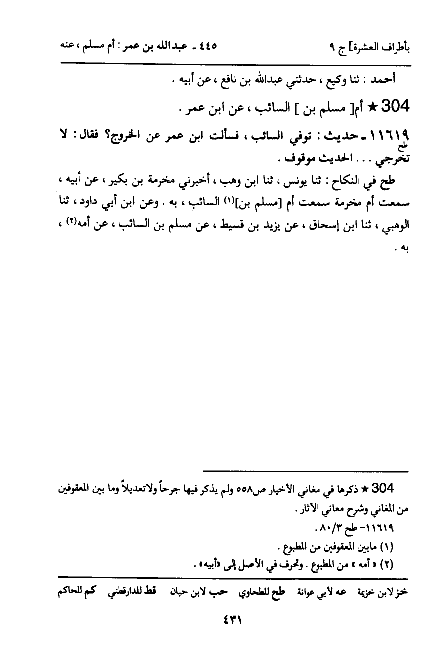 11619 - حَدِيثٌ (طح) : تُوُفِّيَ السَّائِبُ، فَسَأَلْتُ ابْنَ عُمَرَ عَنِ الْخُرُوجِ؟ فَقَالَ: لا تَخْرُجِي ... الْحَدِيثُ مَوْقُوفٌ. طح فِي النِّكَاحِ: ثنا يُونُسُ، ثَنا ابْنُ وَهْبٍ، أَخْبَرَنِي مَخْرَمَةُ بْنُ بُكَيْرٍ، عَنْ أَبِيهِ، سَمِعْتُ أُمَّ مَخْرَمَةَ سَمِعَتْ أُمَّ مُسْلِمِ بْنِ السَّائِبِ، بِهِ. وَعَنِ ابْنِ أَبِي دَاوُدَ، ثنا الْوَهْبِيُّ، ثنا ابْنُ إِسْحَاقَ، عَنْ يَزِيدَ بْنِ قَسِيطٍ، عَنْ مُسْلِمِ بْنِ السَّائِبِ، عَنْ أُمِّهِ، بِهِ.