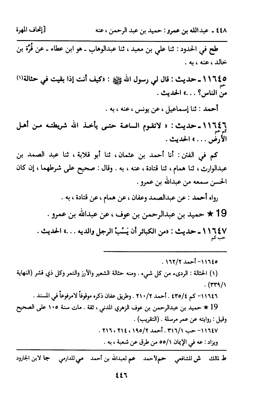 11646 - حَدِيثٌ (كم حم) : " لا تَقُومُ السَّاعَةُ حَتَّى يَأْخُذَ اللَّهُ شَرِيطَتَهُ مِنْ أَهْلِ الأَرْضِ ... " الْحَدِيثَ. كم فِي الْفِتَنِ: أَنَا أَحْمَدُ بْنُ عُثْمَانَ، ثنا أَبُو قِلابَةَ، ثنا عَبْدُ الصَّمَدِ بْنُ عَبْدِ الْوَارِثِ، ثَنا هَمَّامٌ، ثنا قَتَادَةُ، عَنْهُ، بِهِ. وَقَالَ: صَحِيحٌ عَلَى شَرْطِهِمَا، إِنْ كَانَ الْحَسَنُ سَمِعَهُ مِنْ عَبْدِ اللَّهِ بْنِ عَمْرٍو. رَوَاهُ أَحْمَدُ: عَنْ عَبْدِ الصَّمَدِ، وَعَفَّانَ، عَنْ هَمَّامٍ، عَنْ قَتَادَةَ، بِهِ.