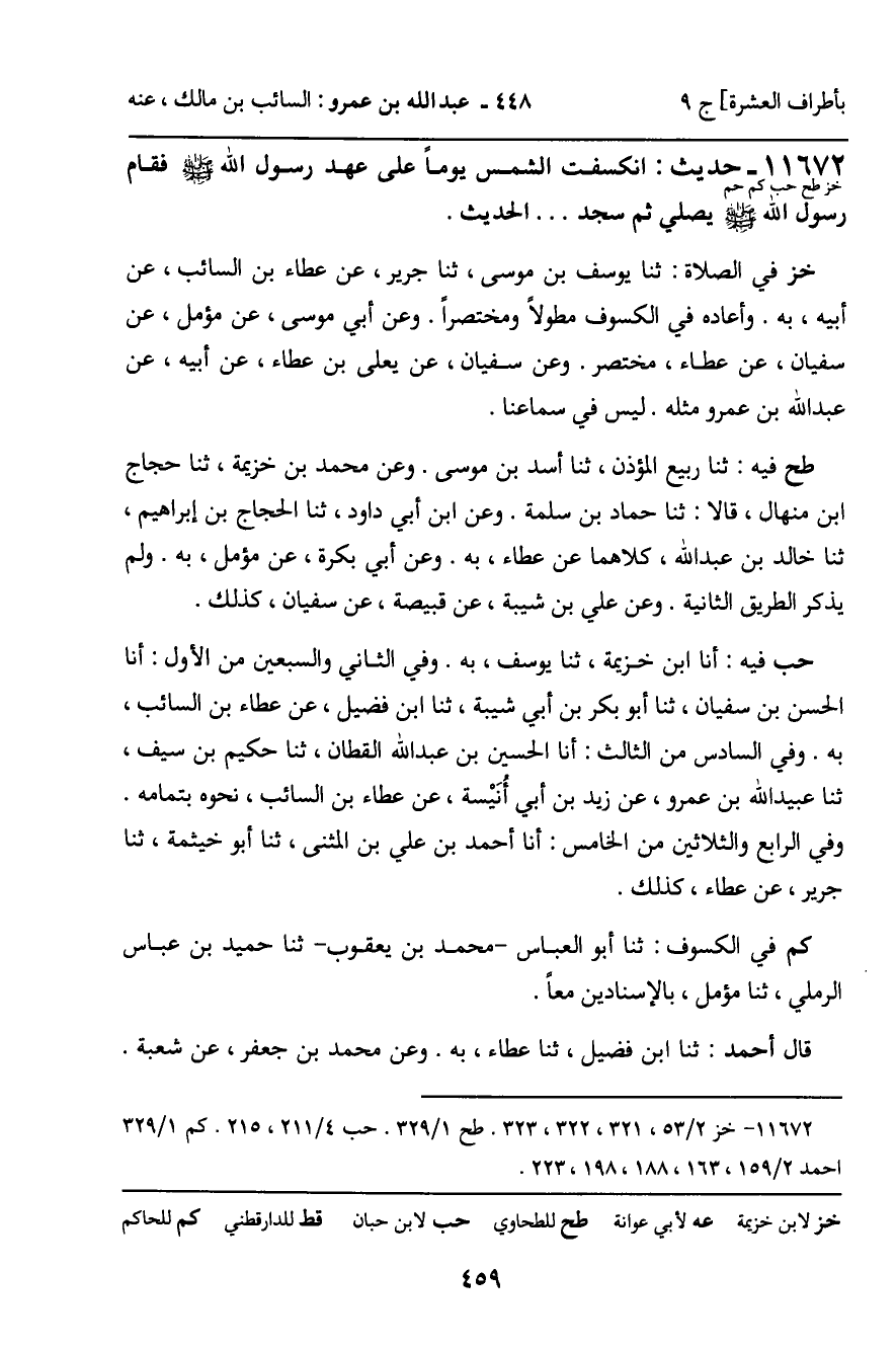 11672 - حَدِيثٌ (خز طح حب كم حم) : انْكَسَفَتِ الشَّمْسُ يَوْمًا عَلَى عَهْدِ رَسُولِ اللَّهِ , صَلَّى اللَّهُ عَلَيْهِ وَسَلَّمَ، فَقَامَ رَسُولُ اللَّهِ , صَلَّى اللَّهُ عَلَيْهِ وَسَلَّمَ، يُصَلِّي ثُمَّ سَجَدَ ... الْحَدِيثَ. خز فِي الصَّلاةِ: ثنا يُوسُفُ بْنُ مُوسَى، ثنا جَرِيرٌ، عَنْ عَطَاءِ بْنِ السَّائِبِ، عَنْ أَبِيهِ، بِهِ. وَأَعَادَهُ فِي الْكُسُوفِ مُطَوَّلا وَمُخْتَصَرًا. وَعَنْ أَبِي مُوسَى، عَنْ مُؤَمَّلٍ، عَنْ سُفْيَانَ، عَنْ عَطَاءٍ، مُخْتَصَرٌ. وَعَنْ سُفْيَانَ، عَنْ يَعْلَى بْنِ عَطَاءٍ، عَنْ أَبِيهِ، عَنْ عَبْدِ اللَّهِ بْنِ عَمْرٍو مِثْلَهُ. لَيْسَ فِي سَمَاعِنَا. طح فِيهِ: ثنا رَبِيعٌ الْمُؤَذِّنُ، ثنا أَسَدُ بْنُ مُوسَى. وَعَنْ مُحَمَّدِ بْنِ خُزَيْمَةَ، ثنا حَجَّاجُ بْنُ مِنْهَالٍ، قَالا: ثنا حَمَّادُ بْنُ سَلَمَةَ. وَعَنِ ابْنِ أَبِي دَاوُدَ، ثنا الْحَجَّاجُ بْنُ إِبْرَاهِيمَ، ثنا خَالِدُ بْنُ عَبْدِ اللَّهِ، كِلاهُمَا عَنْ عَطَاءٍ، بِهِ. وَعَنْ أَبِي بَكْرَةَ، عَنْ مُؤَمَّلٍ، بِهِ. وَلَمْ يَذْكُرِ الطَّرِيقَ الثَّانِيَةَ. وَعَنْ عَلِيِّ بْنِ شَيْبَةَ، عَنْ قَبِيصَةَ، عَنْ سُفْيَانَ، كَذَلِكَ. حب فِيهِ: أَنَا ابْنُ خُزَيْمَةَ، ثنا يُوسُفُ، بِهِ. وَفِي الثَّانِي وَالسَّبْعِينَ مِنَ الأَوَّلِ: أَنَا الْحَسَنُ بْنُ سُفْيَانَ، ثنا أَبُو بَكْرِ بْنُ أَبِي شَيْبَةَ، ثنا ابْنُ فُضَيْلٍ، عَنْ عَطَاءِ بْنِ السَّائِبِ، بِهِ. وَفِي السَّادِسِ مِنَ الثَّالِثِ: أَنَا الْحُسَيْنُ بْنُ عَبْدِ اللَّهِ الْقَطَّانُ، ثنا حَكِيمُ بْنُ سَيْفٍ، ثنا عُبَيْدُ اللَّهِ بْنُ عَمْرٍو، عَنْ زَيْدِ بْنِ أُنَيْسَةَ، عَنْ عَطَاءِ بْنِ السَّائِبِ، نَحْوَهُ بِتَمَامِهِ. وَفِي الرَّابِعِ وَالثَّلاثِينَ مِنَ الْخَامِسِ: أَنَا أَحْمَدُ بْنُ عَلِيِّ بْنِ الْمُثَنَّى، ثنا أَبُو خَيْثَمَةَ، ثنا جَرِيرٌ، عَنْ عَطَاءٍ، كَذَلِكَ. كم فِي الْكُسُوفِ: ثنا أَبُو الْعَبَّاسِ , مُحَمَّدُ بْنُ يَعْقُوبَ، ثنا حُمَيْدُ بْنُ عَبَّاسٍ الرَّمْلِيُّ، ثنا مُؤَمَّلٌ، بِالإِسْنَادَيْنِ مَعًا. قَالَ أَحْمَدُ: ثنا ابْنُ فُضَيْلٍ، ثنا عَطَاءٌ، بِهِ. وَعَنْ مُحَمَّدِ بْنِ جَعْفَرٍ، عَنْ شُعْبَةَ.
