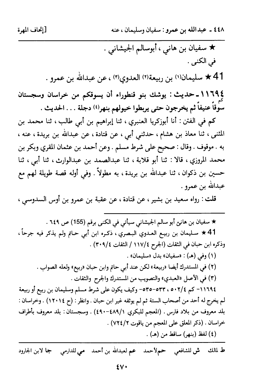 11694 - حَدِيثٌ (كم) : يُوشِكُ بَنُو قَنْطُورَاءَ أَنْ يَسُوقُوكُمْ إِلَى خُرَاسَانَ وَسِجِسْتَانَ سَوْقًا عَنِيفًا , ثُمَّ يَخْرُجُوا حَتَّى يَرْبُطُوا خُيُولَهُمْ بِنَهْرِ دِجْلَةَ ... الْحَدِيثَ. كم فِي الْفِتَنِ: أَنَا أَبُو زَكَرِيَّا الْعَنْبَرِيُّ، ثنا إِبْرَاهِيمُ بْنُ أَبِي طَالِبٍ، ثنا مُحَمَّدُ بْنُ الْمُثَنَّى، ثنا مُعَاذُ بْنُ هِشَامٍ، حَدَّثَنِي أَبِي، عَنْ قَتَادَةَ، عَنْ عَبْدِ اللَّهِ بْنِ بُرَيْدَةَ، عَنْهُ، بِهِ. مَوْقُوفٌ. وَقَالَ: صَحِيحٌ عَلَى شَرْطِ مُسْلِمٍ. وَعَنْ أَحْمَدَ بْنِ عُثْمَانَ الْمُقْرِي، وَبَكْرِ بْنِ مُحَمَّدٍ الْمَرْوَزِيِّ، قَالا: ثنا أَبُو قِلابَةَ، ثَنا عَبْدُ الصَّمَدِ بْنُ عَبْدِ الْوَارِثِ، ثَنا أَبِي، ثنا حُسَيْنُ بْنُ ذَكْوَانَ، ثنا عَبْدُ اللَّهِ بْنُ بُرَيْدَةَ، بِهِ مُطَوَّلا. وَفِي أَوَّلِهِ قِصَّةٌ طَوِيلَةٌ لَهُمْ مَعَ عَبْدِ اللَّهِ بْنِ عَمْرٍو. قُلْتُ: رَوَاهُ سَعِيدُ بْنُ بَشِيرٍ، عَنْ قَتَادَةَ، عَنْ عُقْبَةَ بْنِ عَمْرِو بْنِ أَوْسٍ السَّدُوسِيِّ،