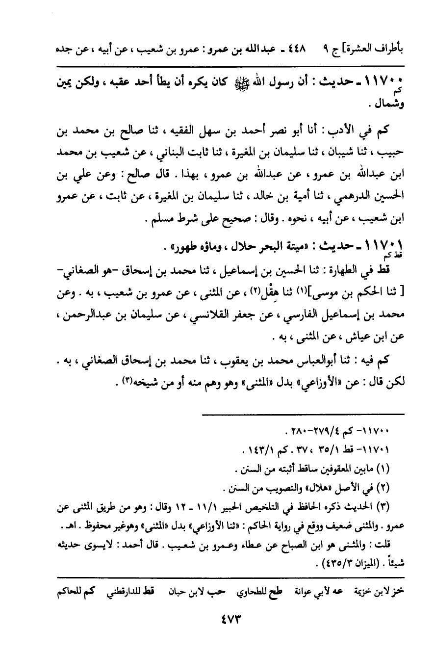 11701 - حَدِيثٌ (قط كم) : " مَيْتَةُ الْبَحْرِ حَلالٌ، وَمَاؤُهُ طَهُورٌ ". قط فِي الطَّهَارَةِ: ثنا الْحُسَيْنُ بْنُ إِسْمَاعِيلَ، ثنا مُحَمَّدُ بْنُ إِسْحَاقَ , هُوَ الصَّغَانِيُّ، ثنا الْحَكَمُ بْنُ مُوسَى، ثَنا هِقْلٌ، عَنِ الْمُثَنَّى، عَنْ عَمْرِو بْنِ شُعَيْبٍ، بِهِ. وَعَنْ مُحَمَّدِ بْنِ إِسْمَاعِيلَ الْفَارِسِيِّ، عَنْ جَعْفَرٍ الْقَلانِسِيِّ، عَنْ سُلَيْمَانَ بْنِ عَبْدِ الرَّحْمَنِ، عَنِ ابْنِ عَيَّاشٍ، عَنِ الْمُثَنَّى، بِهِ. كم فِيهِ: ثنا أَبُو الْعَبَّاسِ مُحَمَّدُ بْنُ يَعْقُوبَ، ثنا مُحَمَّدُ بْنُ إِسْحَاقَ الصَّغَانِيُّ، بِهِ , لَكِنْ قَالَ: عَنِ الأَوْزَاعِيِّ، بَدَلَ الْمُثَنَّى , وَهُوَ وَهْمٌ مِنْهُ أَوْ مِنْ شَيْخِهِ.