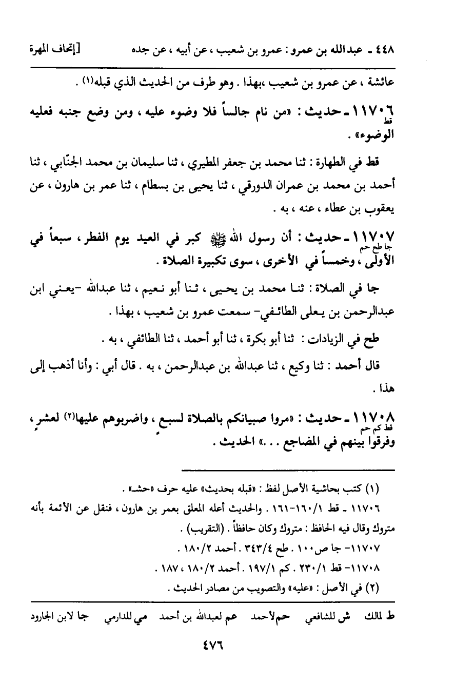 11707 - حَدِيثٌ (جا طح حم) : أَنَّ رَسُولَ اللَّهِ، صَلَّى اللَّهُ عَلَيْهِ وَسَلَّمَ، كَبَّرَ فِي الْعِيدِ يَوْمَ الْفِطْرِ سَبْعًا فِي الأُولَى، وَخَمْسًا فِي الأُخْرَى، سِوَى تَكْبِيرَةِ الصَّلاةِ. جا فِي الصَّلاةِ: ثنا مُحَمَّدُ بْنُ يَحْيَى، ثنا أَبُو نُعَيْمٍ، ثنا عَبْدُ اللَّهِ، يَعْنِي: ابْنَ عَبْدِ الرَّحْمَنِ بْنِ يَعْلَى الطَّائِفِيَّ، سَمِعْتُ عُمَرَ بْنَ شُعَيْبٍ، بِهَذَا. طح فِي الزِّيَادَاتِ: ثنا أَبُو بَكْرَةَ، ثنا أَبُو أَحْمَدَ، ثنا الطَّائِفِيُّ، بِهِ. قَالَ أَحْمَدُ: ثنا وَكِيعٌ، ثنا عَبْدُ اللَّهِ بْنُ عَبْدِ الرَّحْمَنِ، بِهِ. وَقَالَ أَبِي: وَأَنَا أَذْهَبُ إِلَى هَذَا.