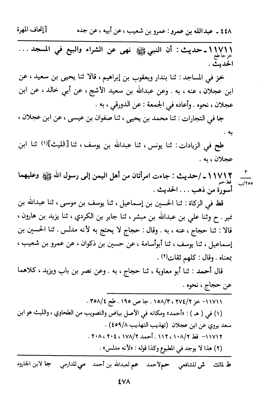 11711 - حَدِيثٌ (خز جا طح) : أَنَّ النَّبِيَّ، صَلَّى اللَّهُ عَلَيْهِ وَسَلَّمَ، نَهَى عَنِ الشِّرَاءِ وَالْبَيْعِ فِي الْمَسْجِدِ ... الْحَدِيثَ. خز فِي الْمَسَاجِدِ: ثنا بُنْدَارٌ، وَيَعْقُوبُ بْنُ إِبْرَاهِيمَ، قَالا: ثنا يَحْيَى بْنُ سَعِيدٍ، عَنِ ابْنِ عَجْلانَ، عَنْهُ، بِهِ. وَعَنْ عَبْدِ اللَّهِ بْنِ سَعِيدٍ الأَشَجِّ، عَنْ أَبِي خَالِدٍ، عَنِ ابْنِ عَجْلانَ، نَحْوَهُ. وَأَعَادَهُ فِي الْجُمُعَةِ: عَنِ الدَّوْرَقِيِّ، بِهِ. جا فِي التِّجَارَاتِ: ثنا مُحَمَّدُ بْنُ يَحْيَى، ثنا صَفْوَانُ بْنُ عِيسَى، عَنِ ابْنِ عَجْلانَ، بِهِ. طح فِي الزِّيَادَاتِ: ثنا يُونُسُ، ثنا عَبْدُ اللَّهِ بْنُ يُوسُفَ، ثنا اللَّيْثُ، ثنا ابْنُ عَجْلانَ، بِهِ.