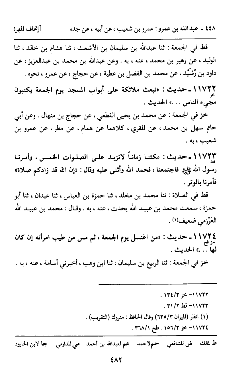 11722 - حَدِيثٌ (خز) : " تُبْعَثُ مَلائِكَةٌ عَلَى أَبْوَابِ الْمَسْجِدِ يَوْمَ الْجُمُعَةِ يَكْتُبُونَ مَجِيءَ النَّاسِ ... " الْحَدِيثَ. خز فِي الْجُمُعَةِ: عَنْ مُحَمَّدِ بْنِ يَحْيَى الْقُطِعِيِّ، عَنْ حَجَّاجِ بْنِ مِنْهَالٍ. وَعَنْ أَبِي حَاتِمٍ سَهْلِ بْنِ مُحَمَّدٍ، عَنِ الْمُقْرِي، كِلاهُمَا عَنْ هَمَّامٍ، عَنْ مَطَرٍ، عَنْ عَمْرِو بْنِ شُعَيْبٍ، بِهِ.
