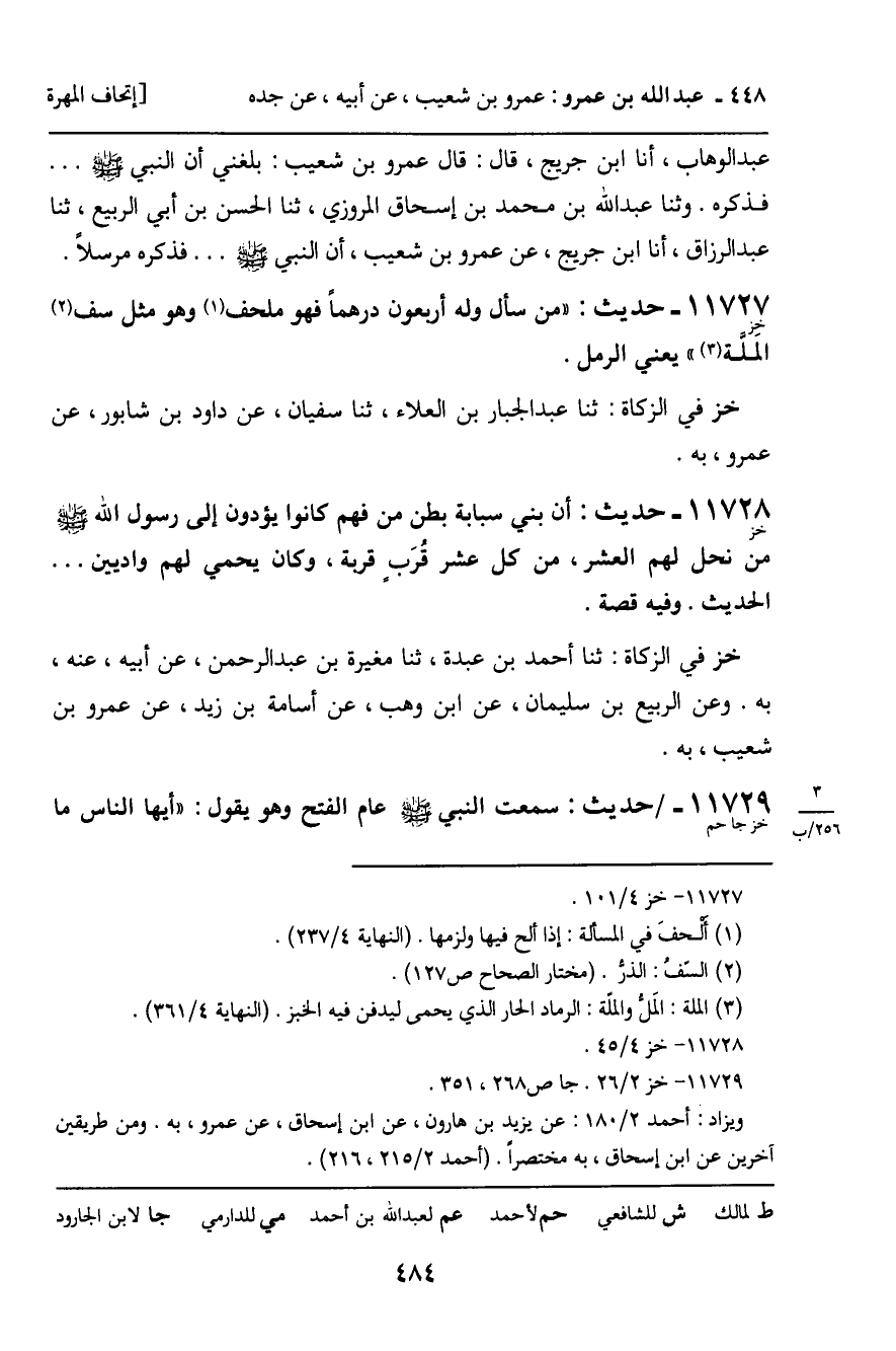 11728 - حَدِيثٌ (خز) : أَنَّ بَنِي سبابَةَ، بَطْنٌ مِنْ فَهْمٍ، كَانُوا يُؤَدُّونَ إِلَى رَسُولِ اللَّهِ، صَلَّى اللَّهُ عَلَيْهِ وَسَلَّمَ، مِنْ نَحْلٍ لَهُمُ الْعُشْرَ، مِنْ كُلِّ عَشْرِ قِرَبٍ قِرْبَةً، وَكَانَ يَحْمِي لَهُمْ وَادِيَيْنِ ... الْحَدِيثَ. وَفِيهِ قِصَّةٌ. خز فِي الزَّكَاةِ: ثنا أَحْمَدُ بْنُ عَبْدَةَ، ثنا مُغِيرَةُ بْنُ عَبْدِ الرَّحْمَنِ، عَنْ أَبِيهِ، عَنْهُ، بِهِ. وَعَنِ الرَّبِيعِ بْنِ سُلَيْمَانَ، عَنِ ابْنِ وَهْبٍ، عَنْ أُسَامَةَ بْنِ زَيْدٍ، عَنْ عَمْرِو بْنِ شُعَيْبٍ، بِهِ.