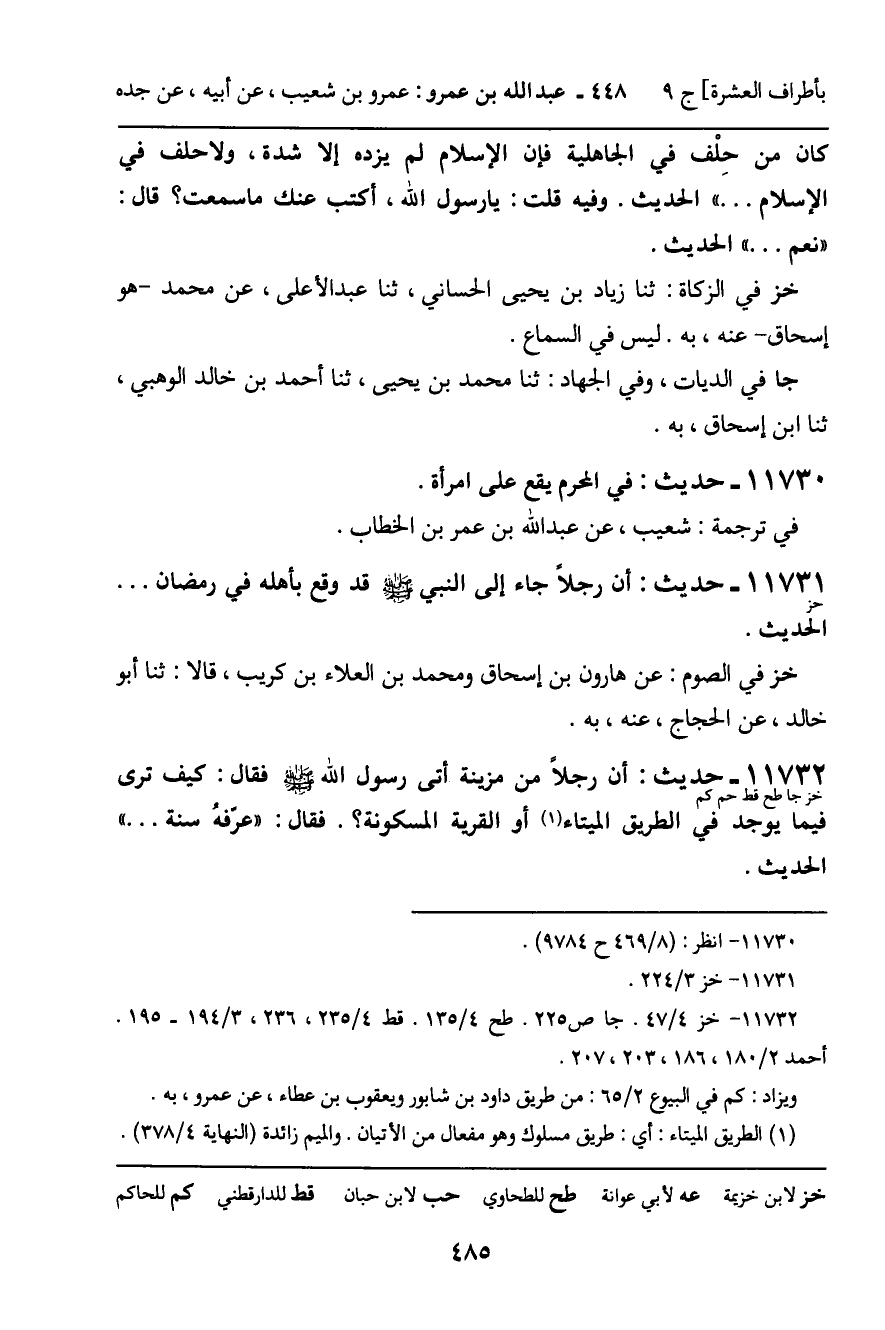 -[486]- خز فِي الزَّكَاةِ: ثنا يُونُسُ بْنُ عَبْدِ الأَعْلَى، ثنا ابْنُ وَهْبٍ، أَخْبَرَنِي عَمْرُو بْنُ الْحَارِثِ، وَهِشَامُ بْنُ سَعْدٍ، عَنْهُ، بِهِ. وَعَنْ يُوسُفَ بْنِ مُوسَى، عَنْ جَرِيرٍ، عَنْ مُحَمَّدِ بْنِ إِسْحَاقَ، عَنْ عَمْرِو بْنِ شُعَيْبٍ. وَفِي رِوَايَةِ يُونُسَ، عَنْ عَمْرٍو، عَنْ أَبِيهِ، عَنْ عَبْدِ اللَّهِ بْنِ عَمْرِو بْنِ الْعَاصِ. وَفِي رِوَايَةِ يُوسُفَ، عَنْ جَدِّهِ عَلَى الْجَادَّةِ. لَيْسَ فِي سَمَاعِنَا. جا فِي الْبُيُوعِ: ثنا ابْنُ عَبْدِ الْحَكَمِ، أَنَّ ابْنَ وَهْبٍ أَخْبَرَهُمْ، بِهِ. طح فِيهِ: عَنْ يُونُسَ، عَنِ ابْنِ وَهْبٍ بِضَالَّةِ الْغَنَمِ وَالإِبِلِ، حَسْبُ. قط فِيهِ، وَفِي الأَحْكَامِ: ثنا أَبُو بَكْرٍ النَّيْسَابُورِيُّ، ثنا يُونُسُ بْنُ عَبْدِ الأَعْلَى، بِهِ. وَفِي الْحُدُودِ: كَتَبَ إِلَيْنَا أَحْمَدُ بْنُ عُمَرَ بْنِ يُوسُفَ، ثنا مُحَمَّدُ بْنُ هَاشِمٍ الْبَعْلَبَكِّيُّ، ثنا سُوَيْدُ بْنُ عَبْدِ الْعَزِيزِ، ثنا سُفْيَانُ بْنُ حُسَيْنٍ، عَنْ عَمْرِو بْنِ شُعَيْبٍ، بِهِ. مُطَوَّلا. وَفِي الأَحْكَامِ: ثنا أَبُو عُبَيْدٍ الْقَاسِمُ بْنُ إِسْمَاعِيلَ، ثنا إِبْرَاهِيمُ بْنُ رَاشِدٍ، ثنا دَاوُدُ بْنُ مِهْرَانَ، ثنا دَاوُدُ بْنُ الزِّبْرِقَانِ، عَنْ أَيُّوبَ السَّخْتِيَانِيِّ، وَيَعْقُوبَ بْنِ عَطَاءٍ، عَنْ عَمْرِو بْنِ شُعَيْبٍ، بِقِصَّةِ ضَالَّةِ الإِبِلِ وَالْغَنَمِ حَسْبُ. رَوَاهُ أَحْمَدُ: عَنْ يَعْلَى، وَابْنِ إِدْرِيسَ، وَيَزِيدَ، ثَلاثَتُهُمْ عَنْ مُحَمَّدِ بْنِ إِسْحَاقَ، عَنْهُ، بِهِ. وَعَنْ حَسَنِ بْنِ مُحَمَّدٍ، عَنِ ابْنِ أَبِي الزِّنَادِ، عَنْ عَبْدِ الرَّحْمَنِ بْنِ الْحَارِثِ، عَنْهُ، نَحْوَهُ.