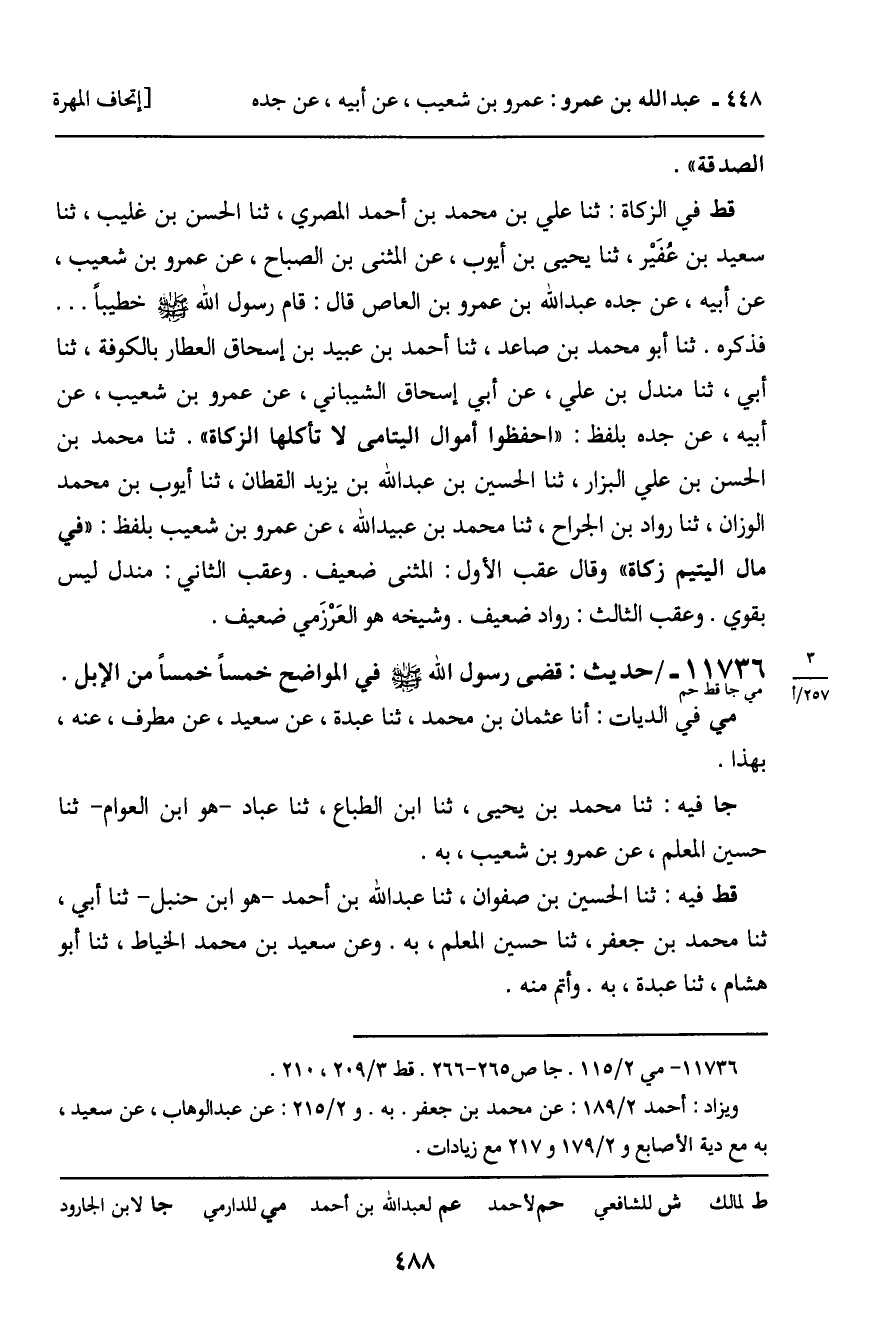 11736 - حَدِيثٌ (مي جا قط حم) : قَضَى رَسُولُ اللَّهِ، صَلَّى اللَّهُ عَلَيْهِ وَسَلَّمَ، فِي الْمَوَاضِحِ خَمْسًا خَمْسًا مِنَ الإِبِلِ. مي فِي الدِّيَاتِ: أَنَا عُثْمَانُ بْنُ مُحَمَّدٍ، ثنا عَبْدَةُ، عَنْ سَعِيدٍ، عَنْ مُطَرِّفٍ، عَنْهُ، بِهَذَا. جا فِيهِ: ثنا مُحَمَّدُ بْنُ يَحْيَى، ثنا ابْنُ الطَّبَّاعِ، ثنا عَبَّادٌ، هُوَ ابْنُ الْعَوَّامِ، ثنا حُسَيْنٌ الْمُعَلَّمُ، عَنْ عَمْرِو بْنِ شُعَيْبٍ، بِهِ. قط فِيهِ: ثنا الْحُسَيْنُ بْنُ صَفْوَانَ، ثنا عَبْدُ اللَّهِ بْنُ أَحْمَدَ، هُوَ ابْنُ حَنْبَلٍ، ثنا أَبِي، ثنا مُحَمَّدُ بْنُ جَعْفَرٍ، ثنا حُسَيْنٌ الْمُعَلَّمُ، بِهِ. وَعَنْ سَعِيدِ بْنِ مُحَمَّدٍ الْخَيَّاطِ، ثنا أَبُو هِشَامٍ، ثنا عَبْدَةُ، بِهِ. وَأَتَمَّ مِنْهُ.